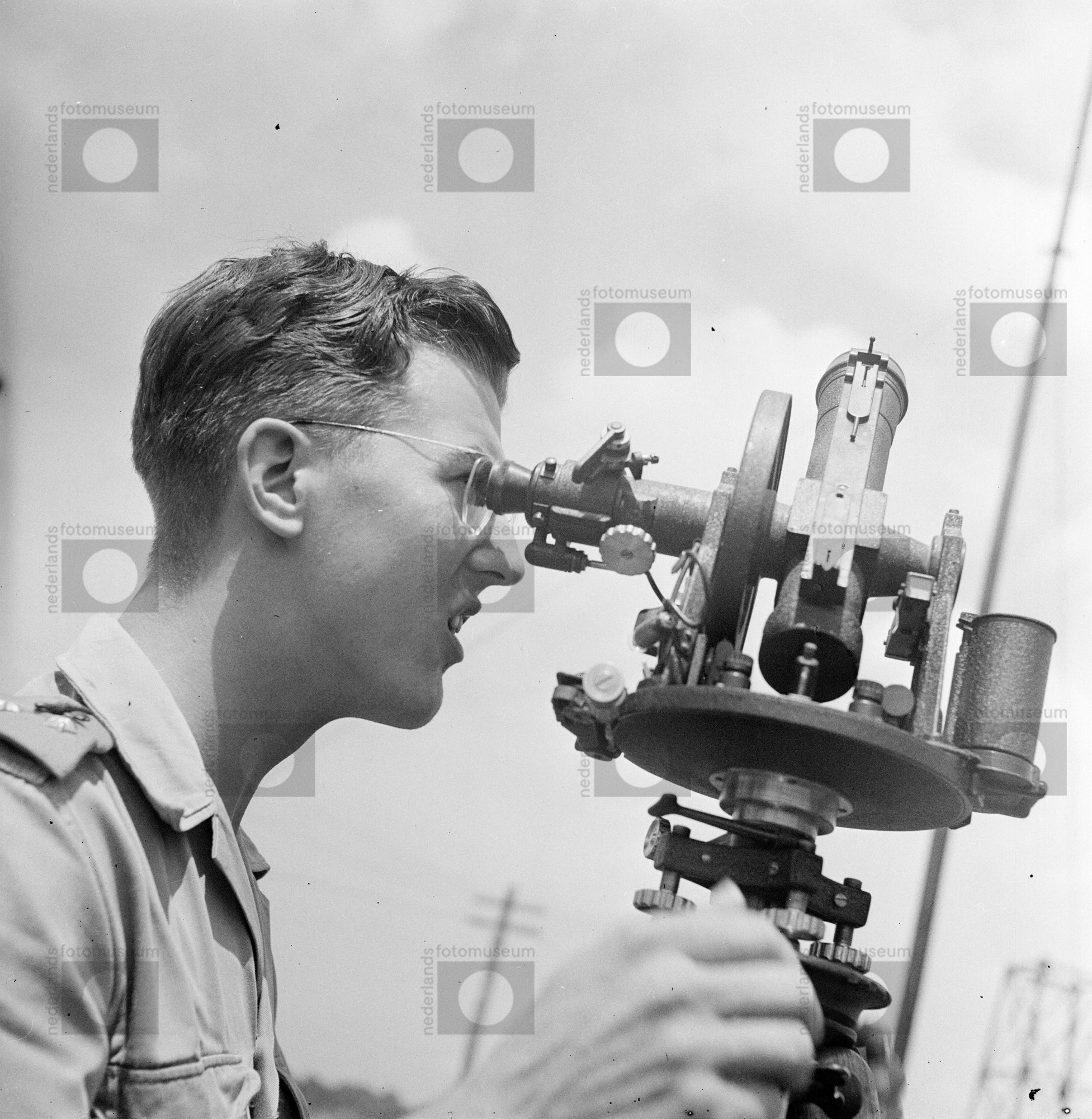 Een man bedient een meetinstrument voor driehoeksmet...