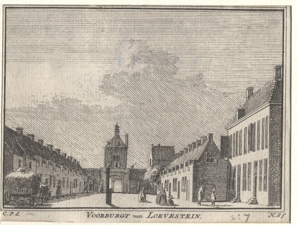 Gezicht op de voorburcht van het slot Loevestein met...