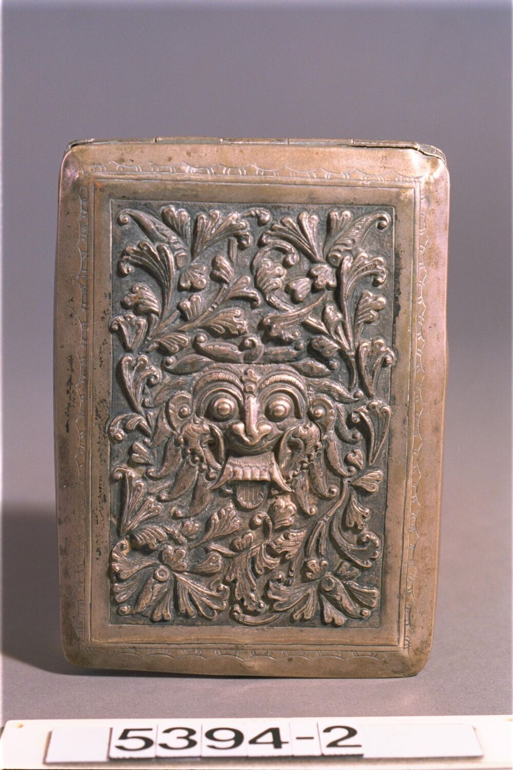 Zilveren sigarettendoos met mogelijk een Rangda kop