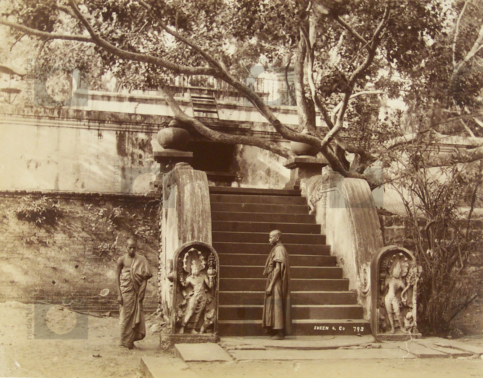 Monniken bij trap in boeddhistisch tempelcomplex, Sr...