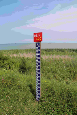 Peilschaal in IJsselmeerdijk bij Zuiderzeemuseum, En...