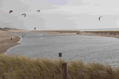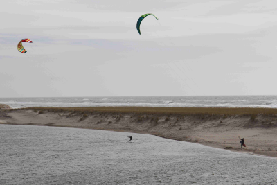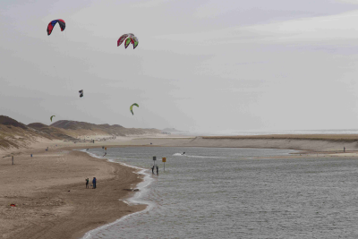 Kitesurfers op de lagune in de nieuwe opspuiting voo...