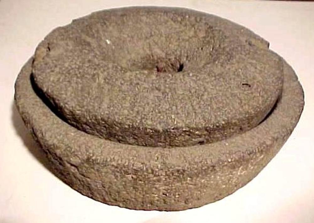 handmolen, komvormige steen met ijzeren pin in het m...