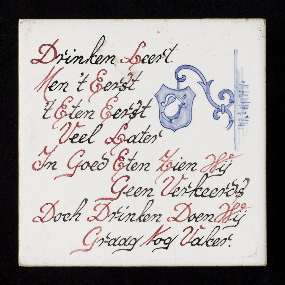 Tegel in tinglazuur, met tekst: Drinken leert men 't...