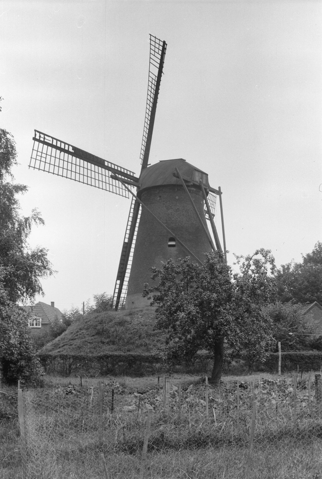 Ronde stenen beltmolen van opzij gefotografeerd