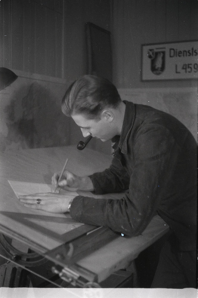 Een Duitse militair achter een tekentafel vult de pa...