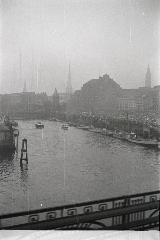 Schepen aan de kade van de Ober Hafen in Hamburg met...