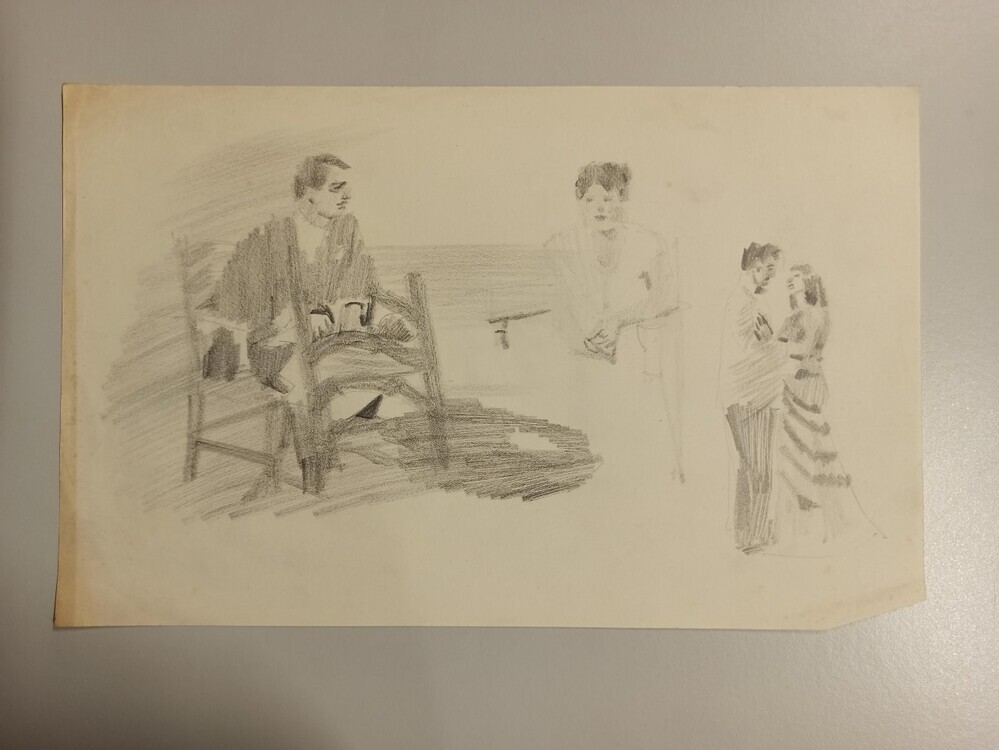 Schets van dansend stel en stel zittend op een stoel