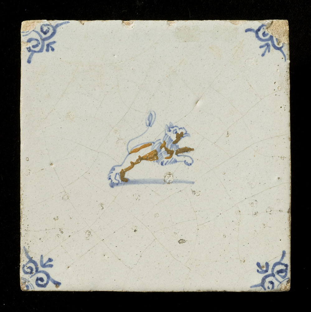 Tegel in tinglazuur, voorstellende springende leeuw,...