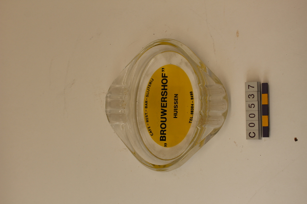Glazen asbak met opschrift Brouwershof Huissen