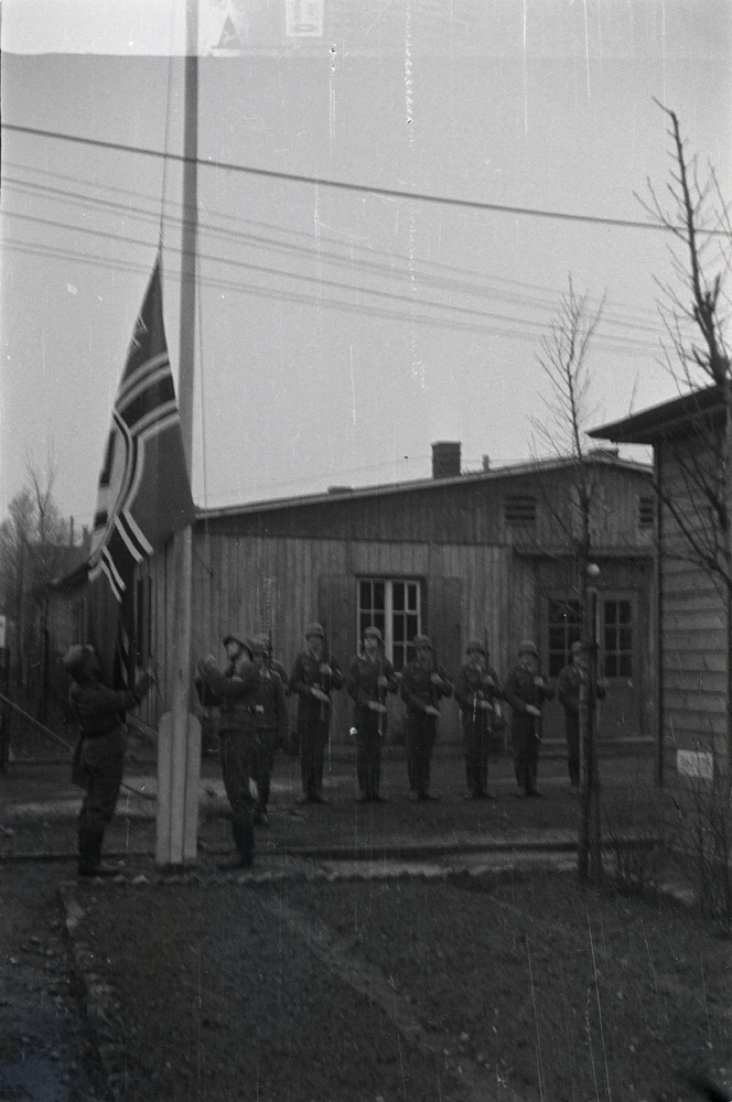Appèl en het hijsen van de vlag bij barakken.