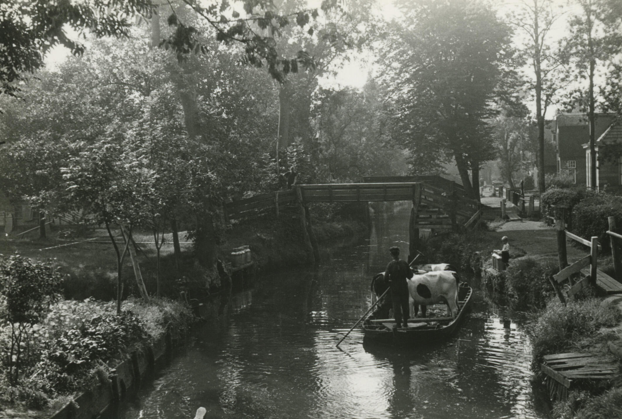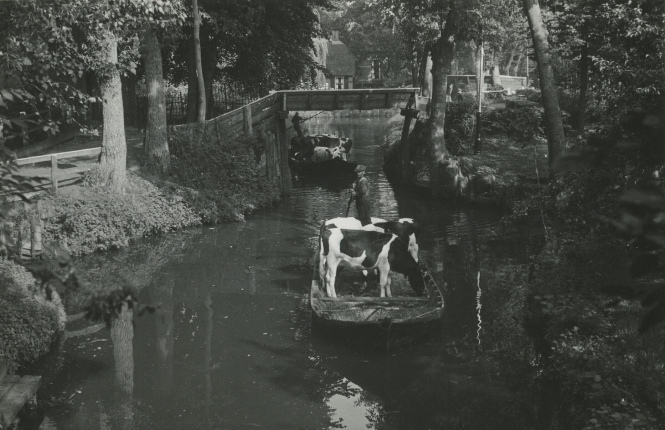 Vervoer van koeien op een bok, Giethoorn, 1939 (zwar...