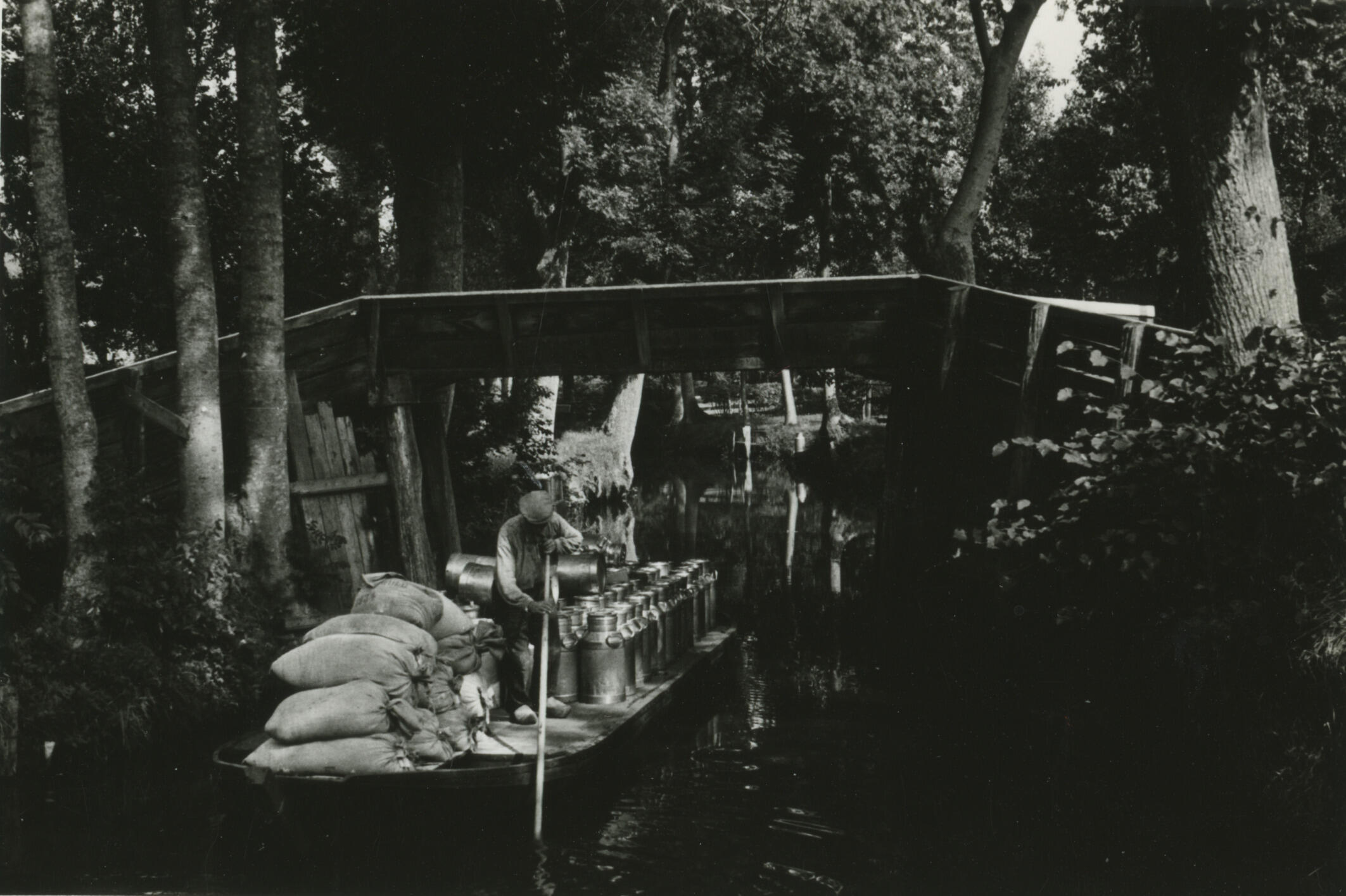 Vervoer van melkbussen op een bok, Giethoorn, 1939 (...