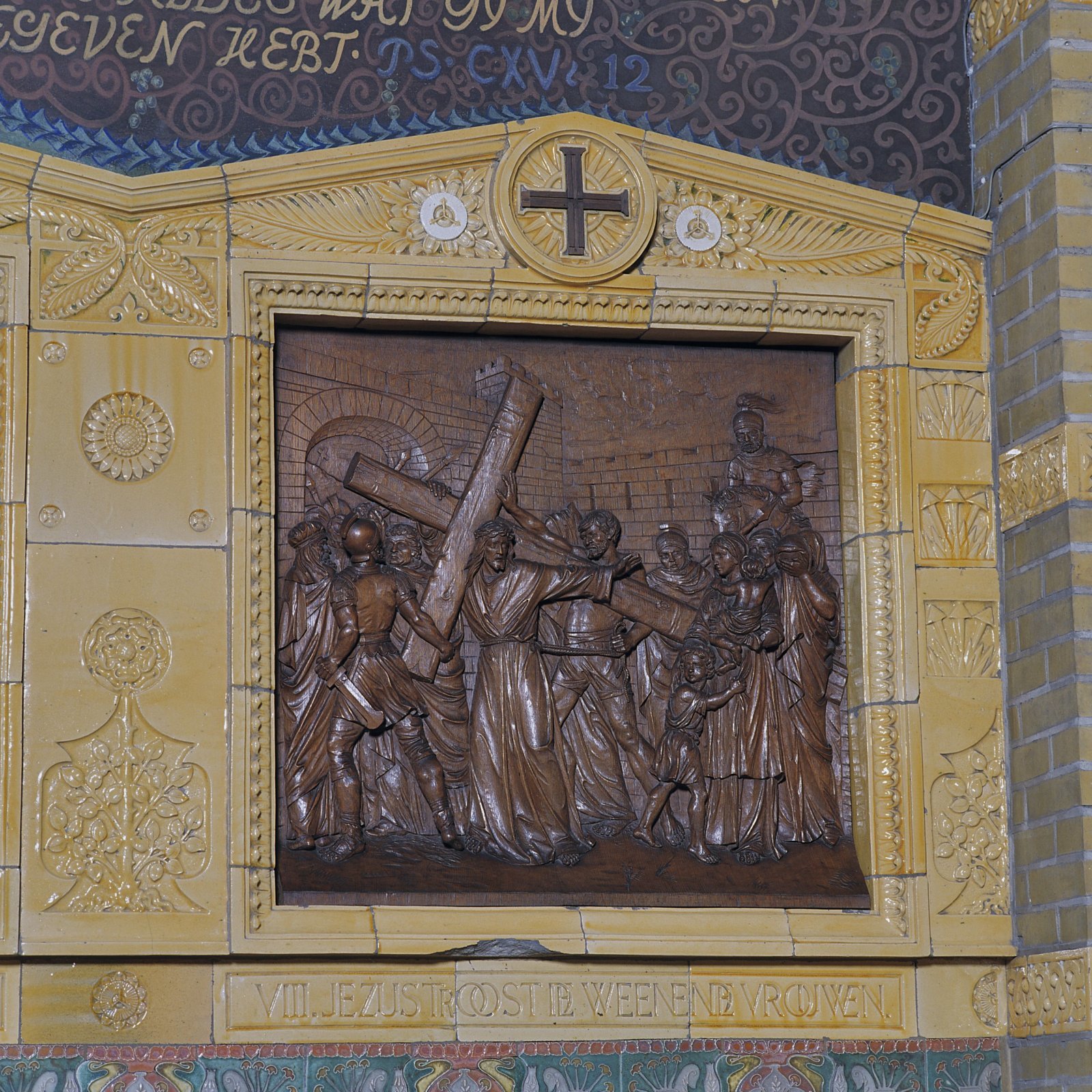 Interieur, houtsnijwerk, wandreliƫf: kruiswegstatie