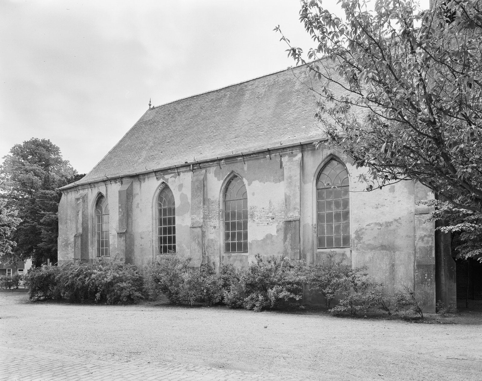 Overzicht van de zuidoostgevel met de kerktoren en d...