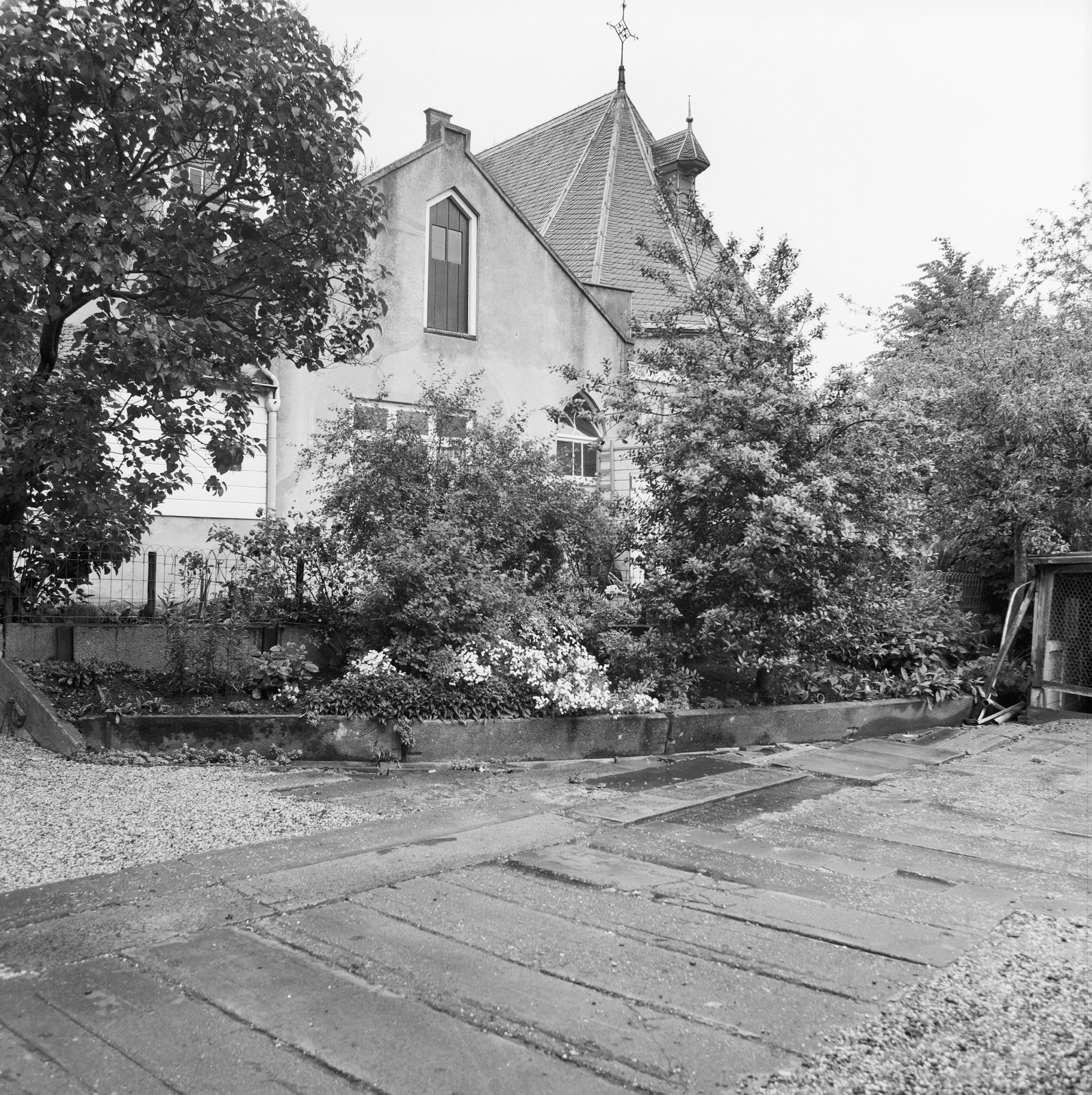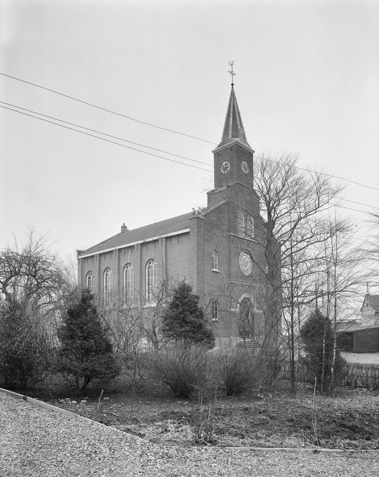 Noordzijde kerkgebouw, omgeven door struiken en bomen