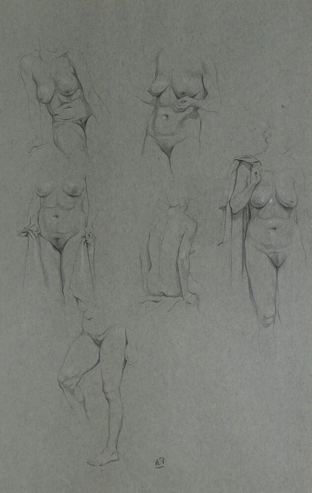 Blad met zes modelstudies van vrouwelijk naakt