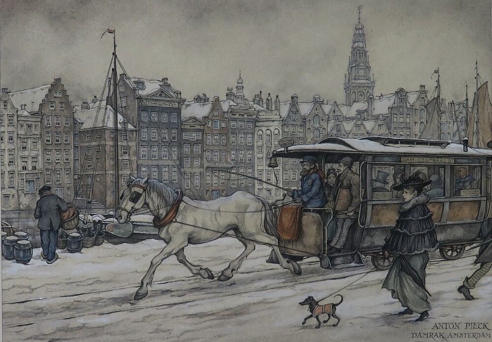 Tram met paard ervoor, kalenderplaat 'Amsterdam, Dam...