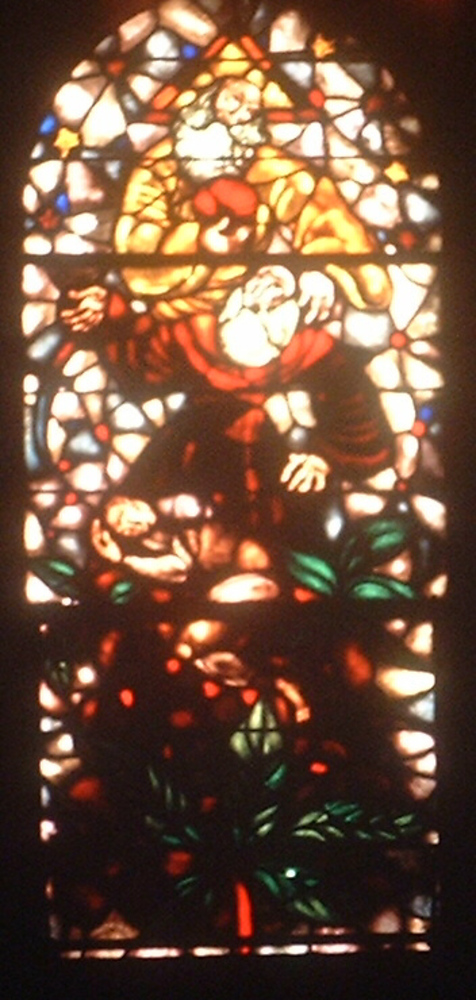 Glasraam in de Huissense stadskerk.Abraham die Isaac...