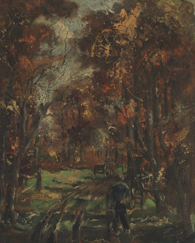 Bosweg met boer en paard en wagen in de herfst