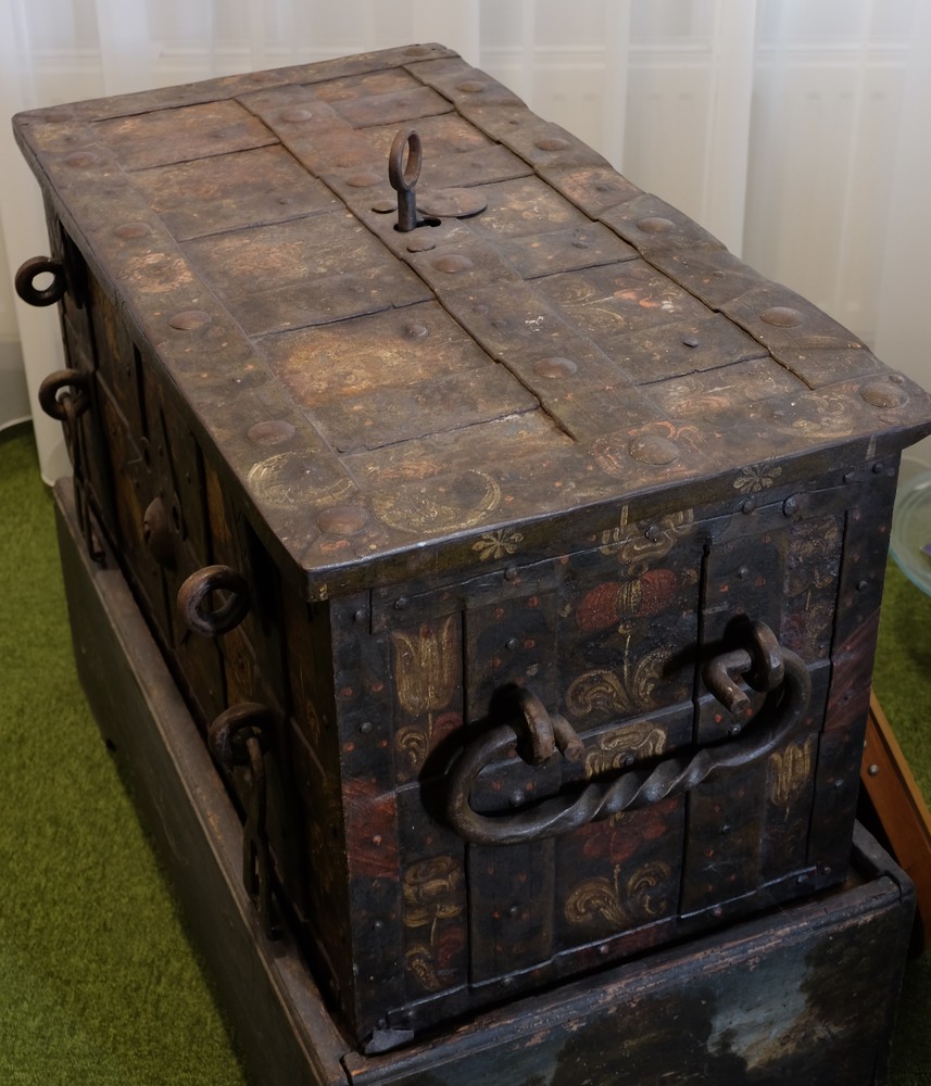 Beschilderde ijzeren geld- of documentenkist