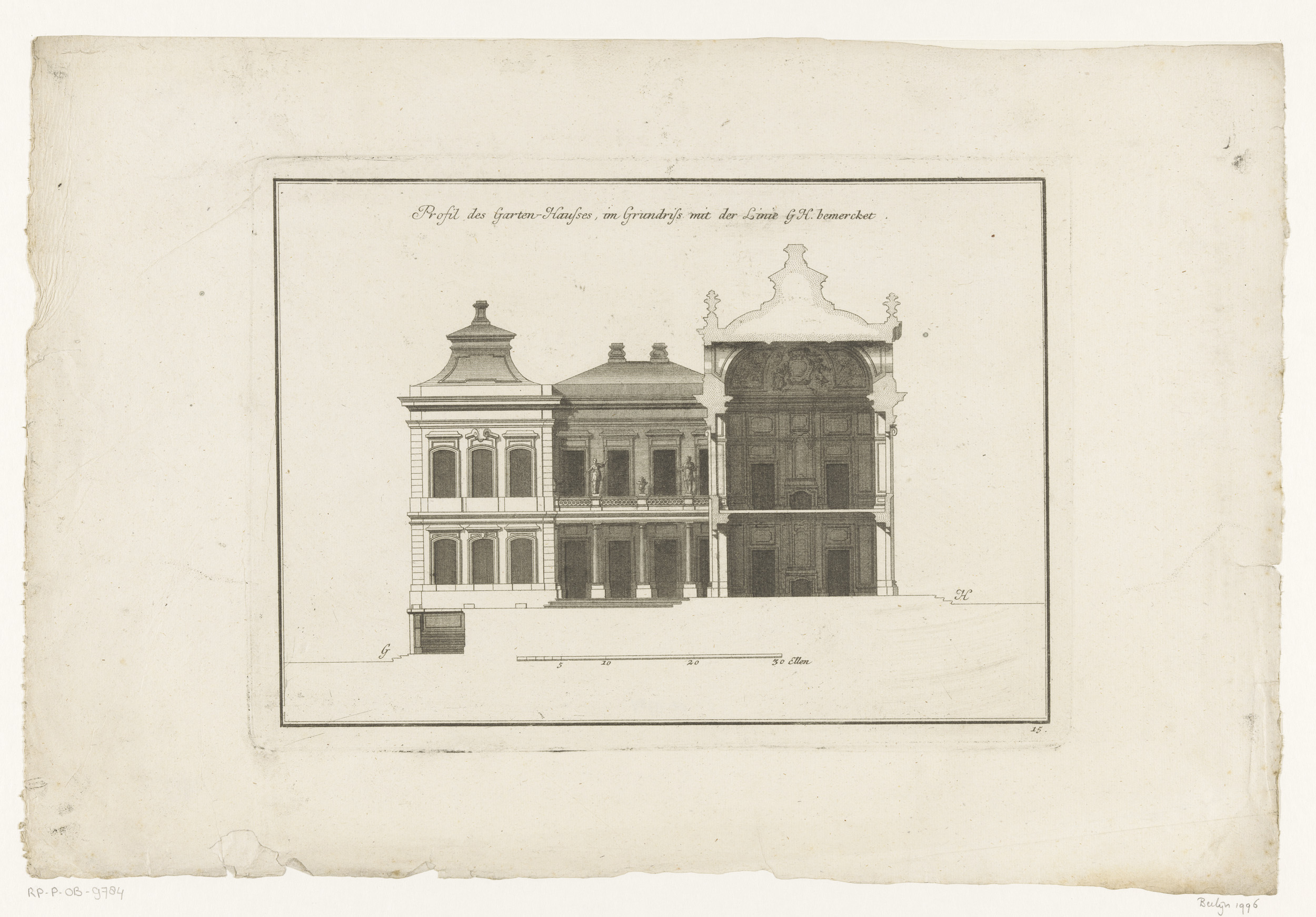 Langsdoorsnede van een tuinpaviljoen