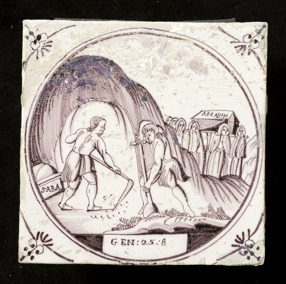 Tegel in tinglazuur, voorstellende gen. 25:8 Abraham...