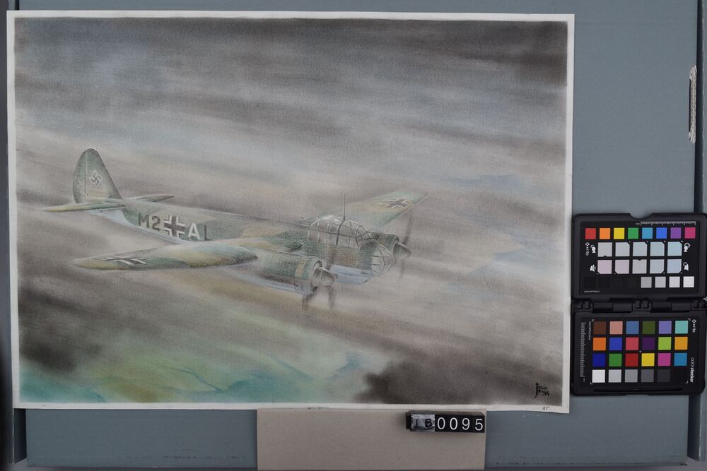 Houtskool / Pasteltekening van een Ju-88 boven Engeland