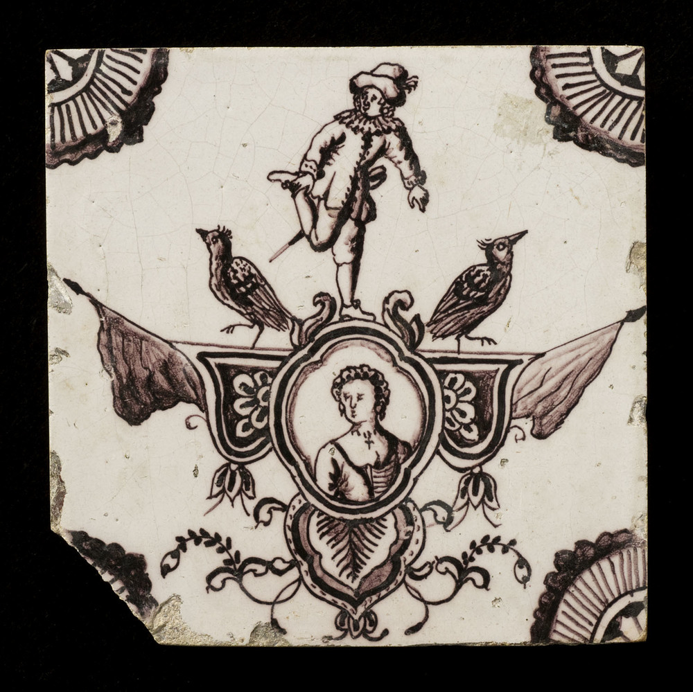 Tegel van keramiek, tinglazuur, voorstellende orname...