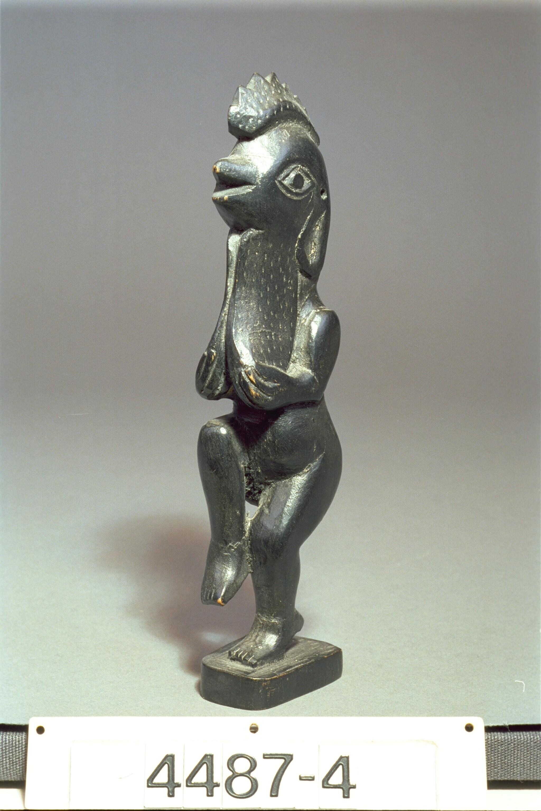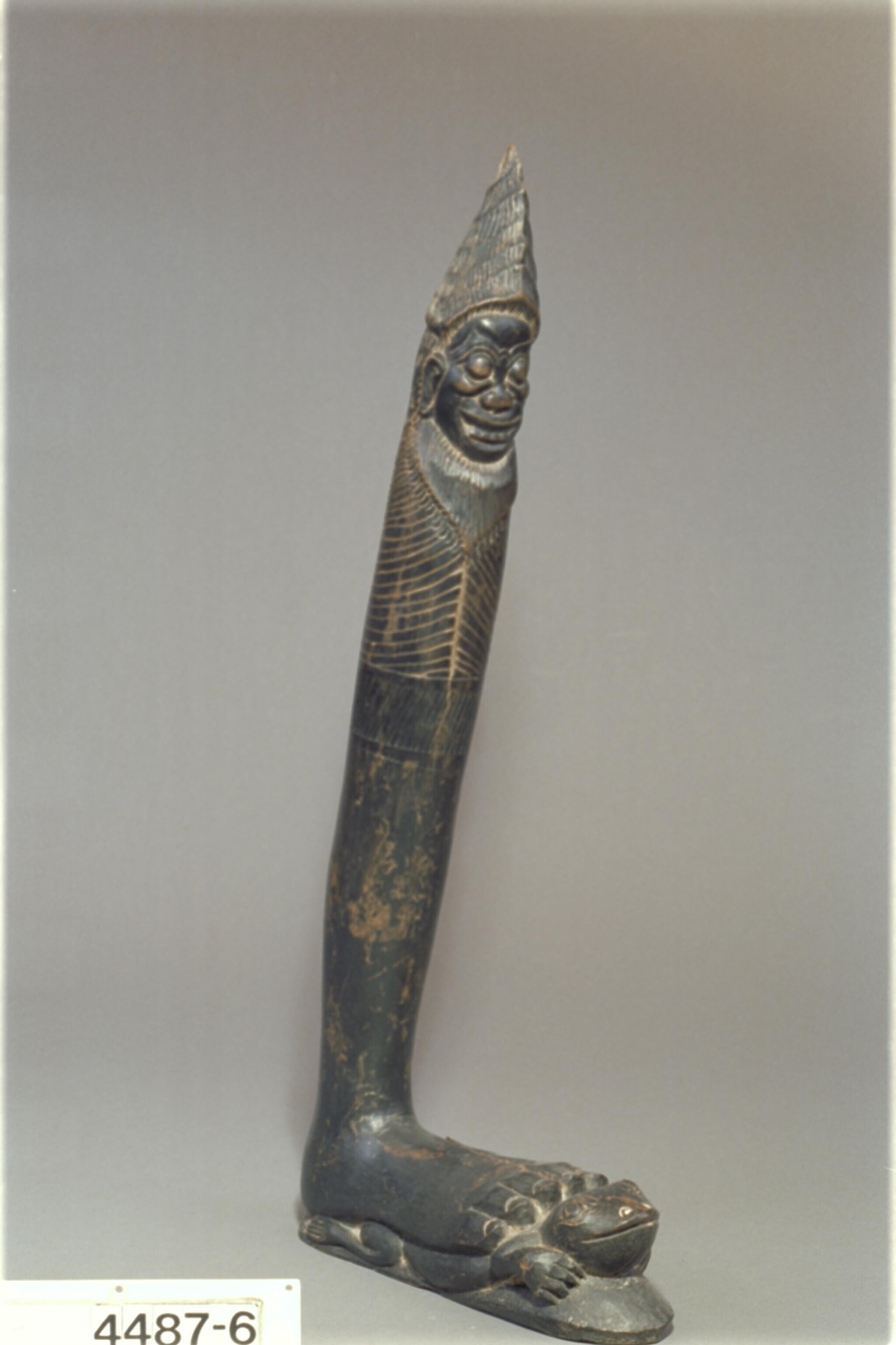 Houten beeld van een eenbenig wezen met een kikvors ...