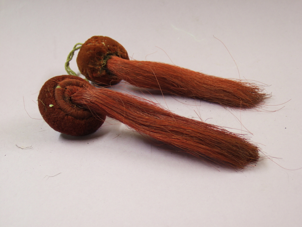 Kwasten van paardenhaar met stoffen bol, rood geverfd.