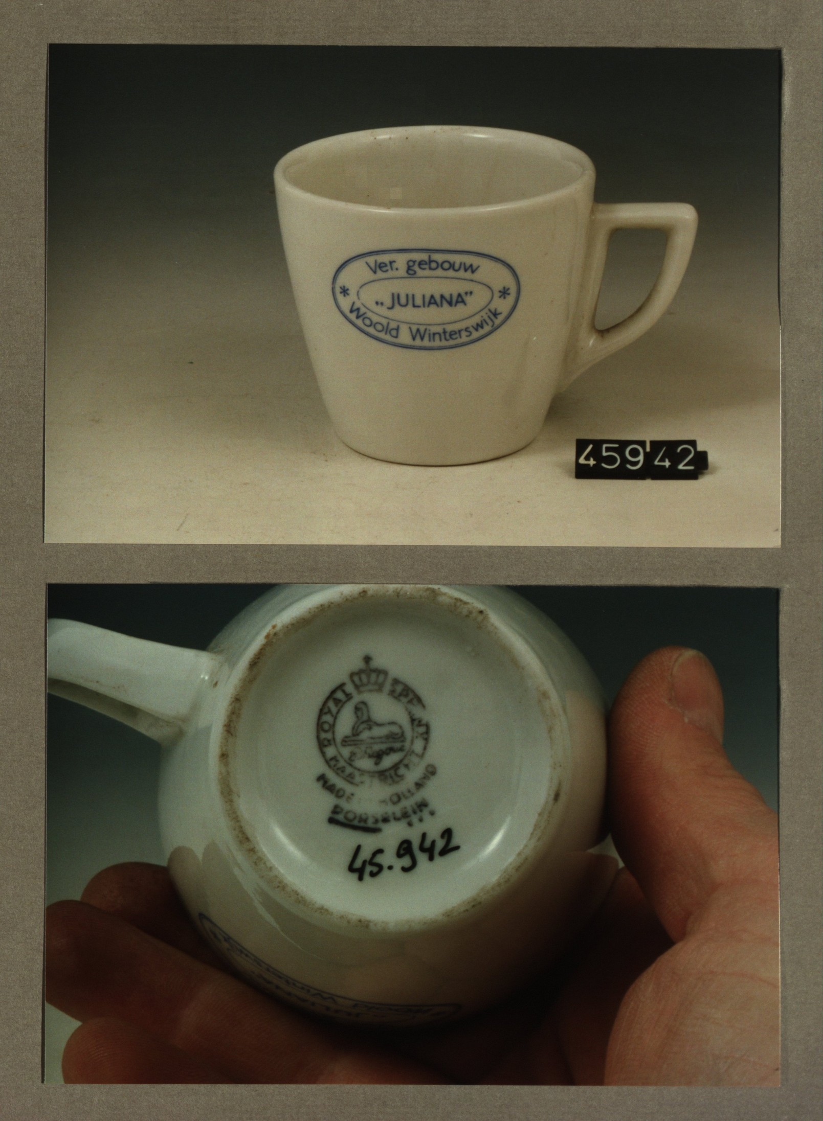 Kop met opschrift, model P met decor Ver.gebouw Juli...