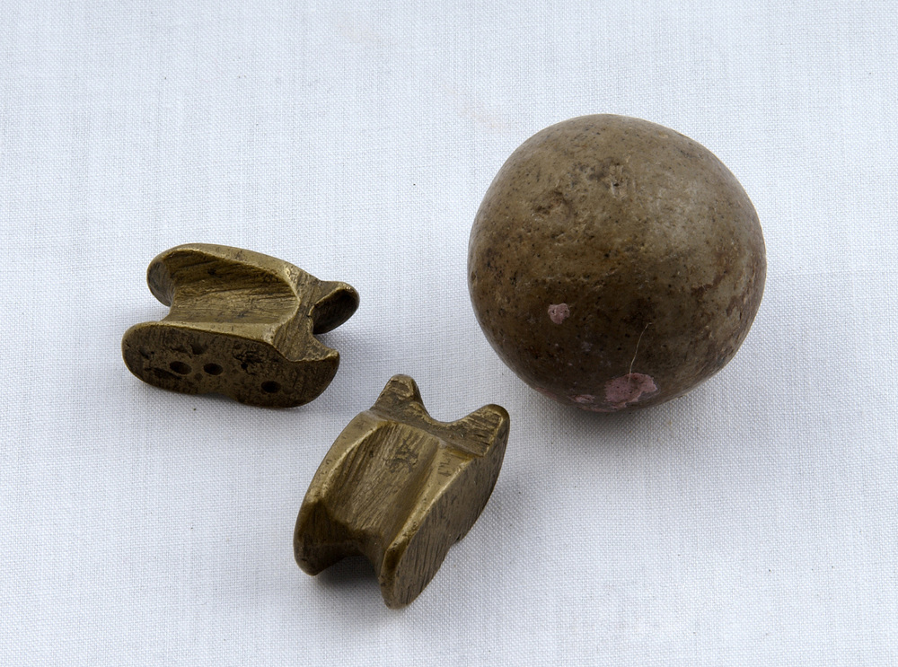 Bikkelspel, bestaande uit 2 koperen bikkels en 1 aar...