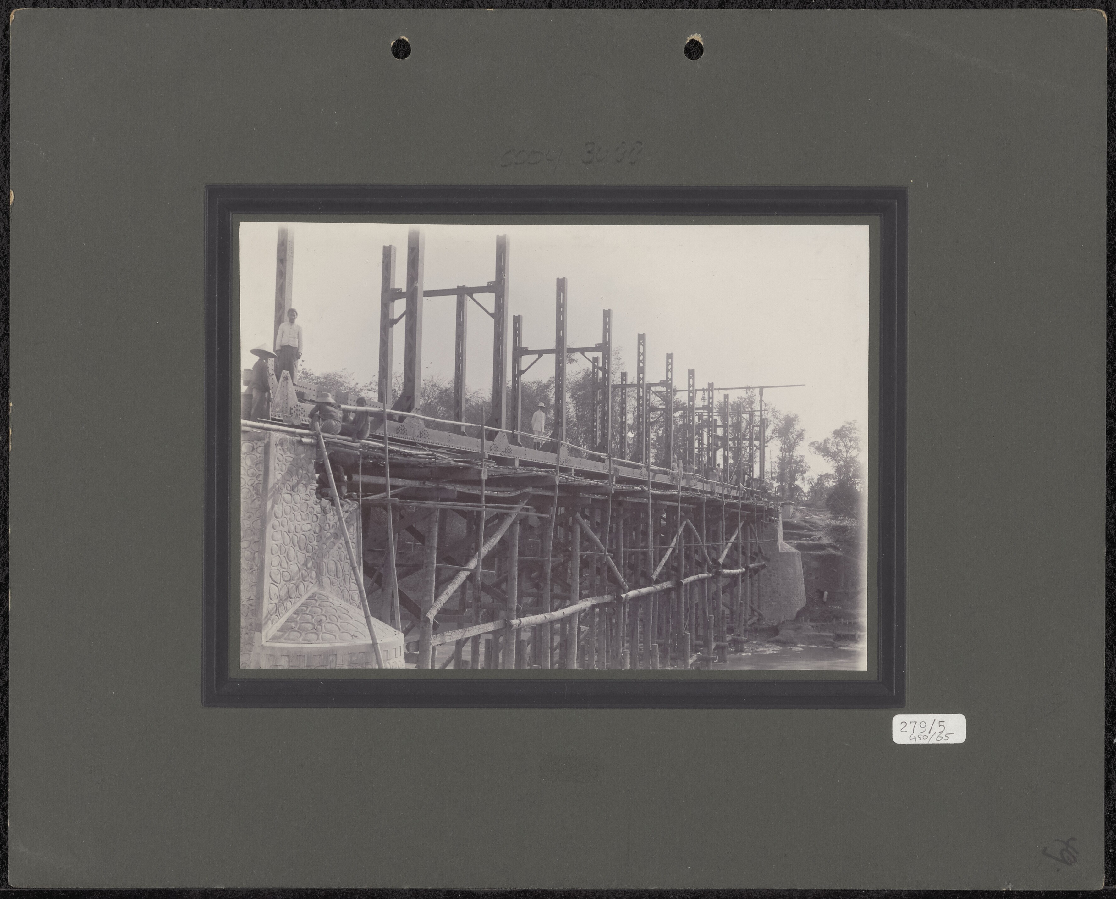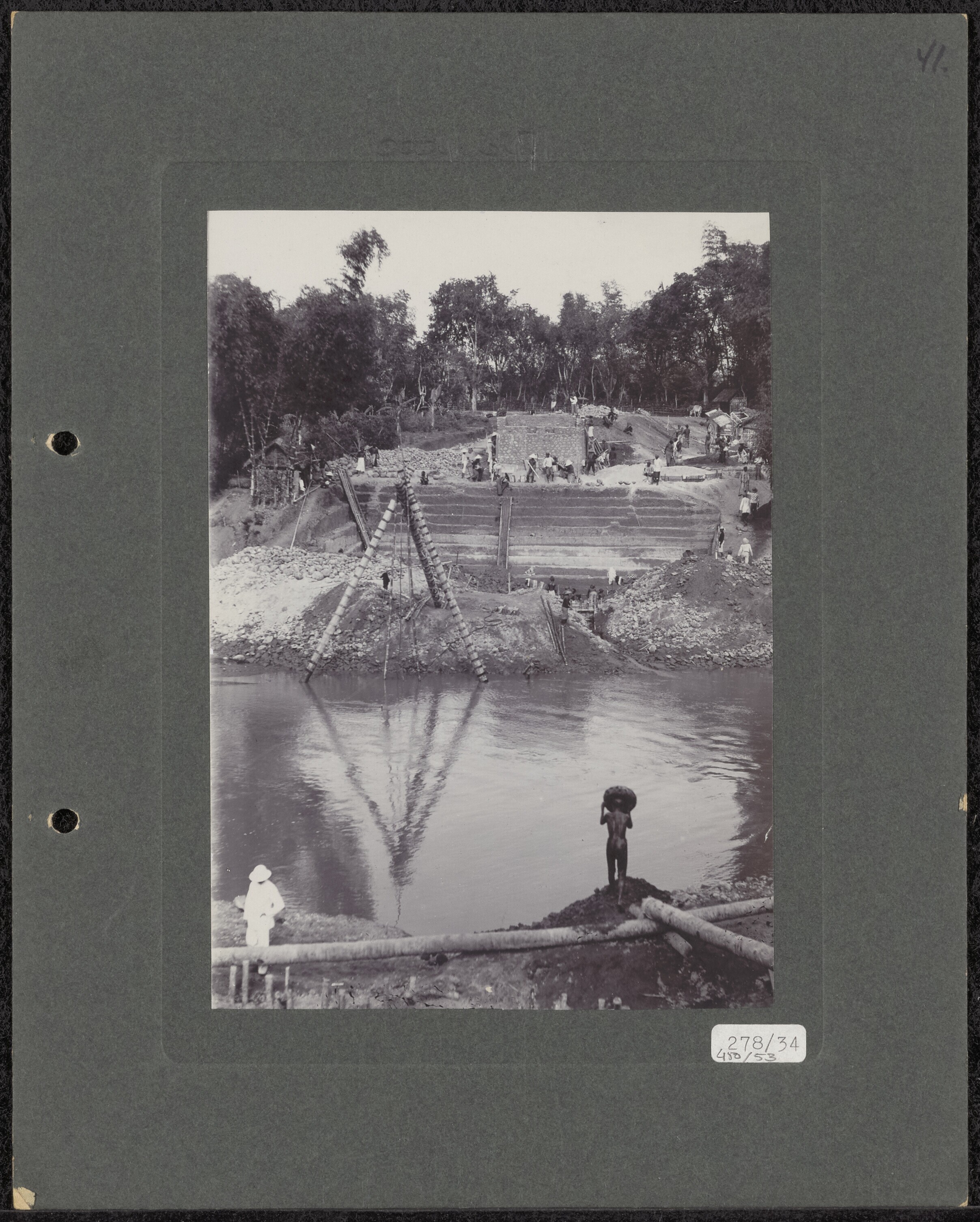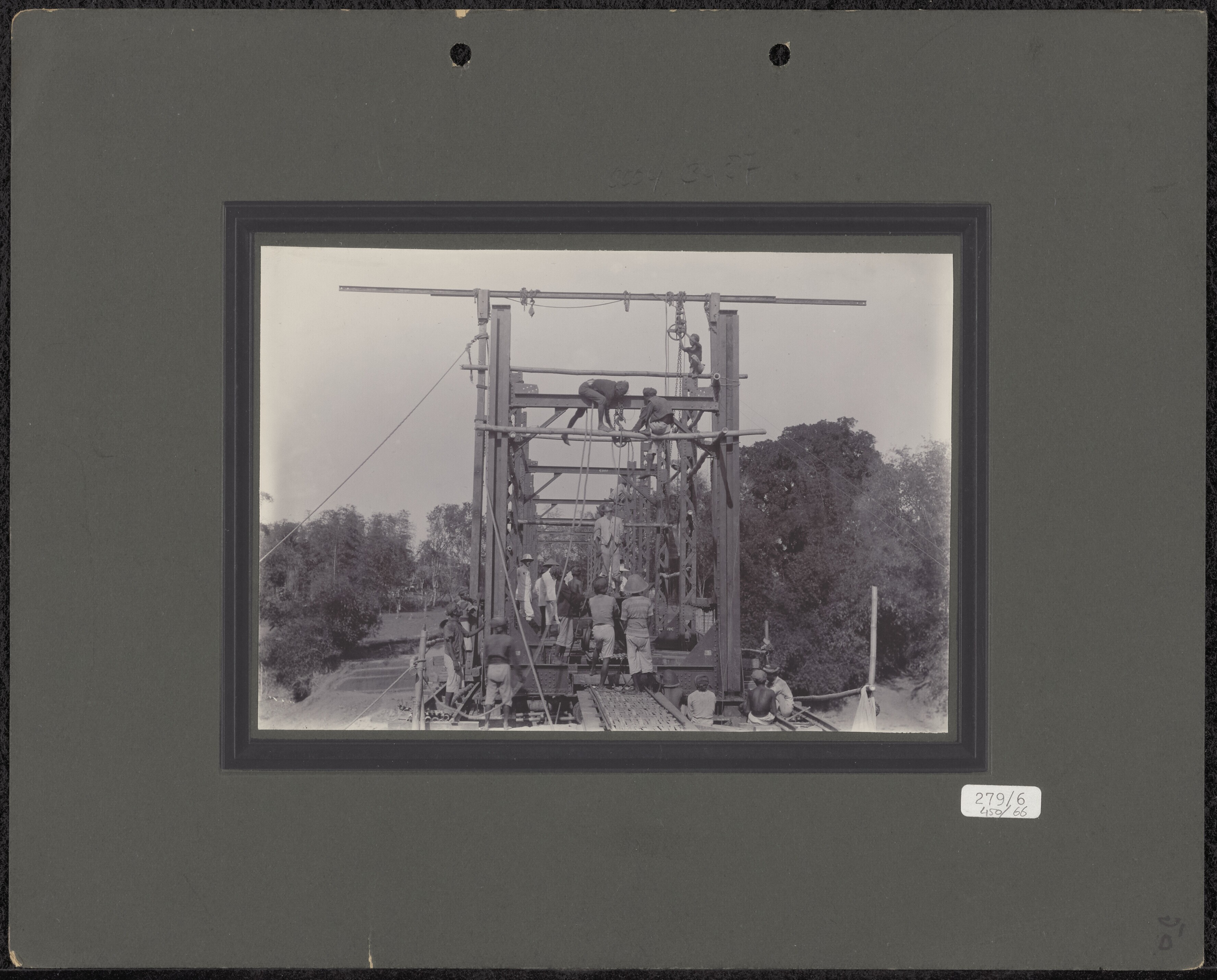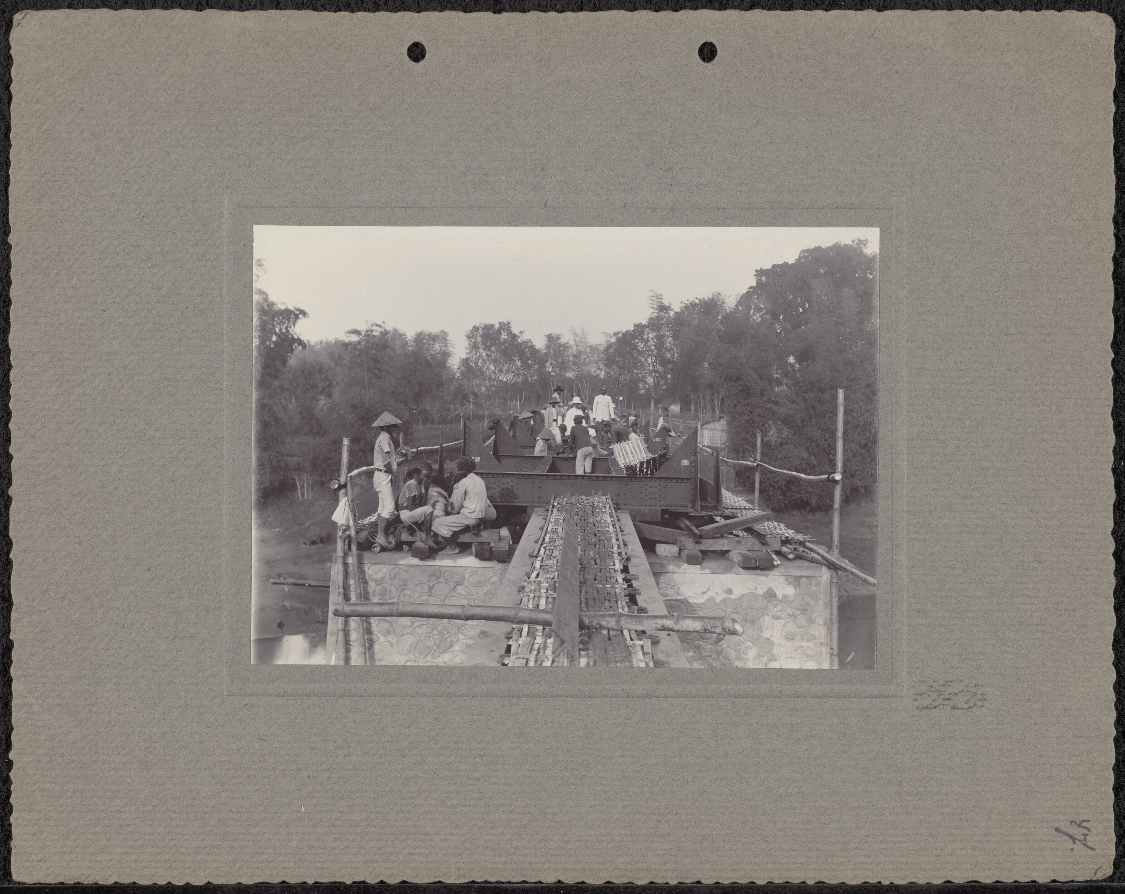 Aanleg van een ijzeren spoorbrug over de rivier
