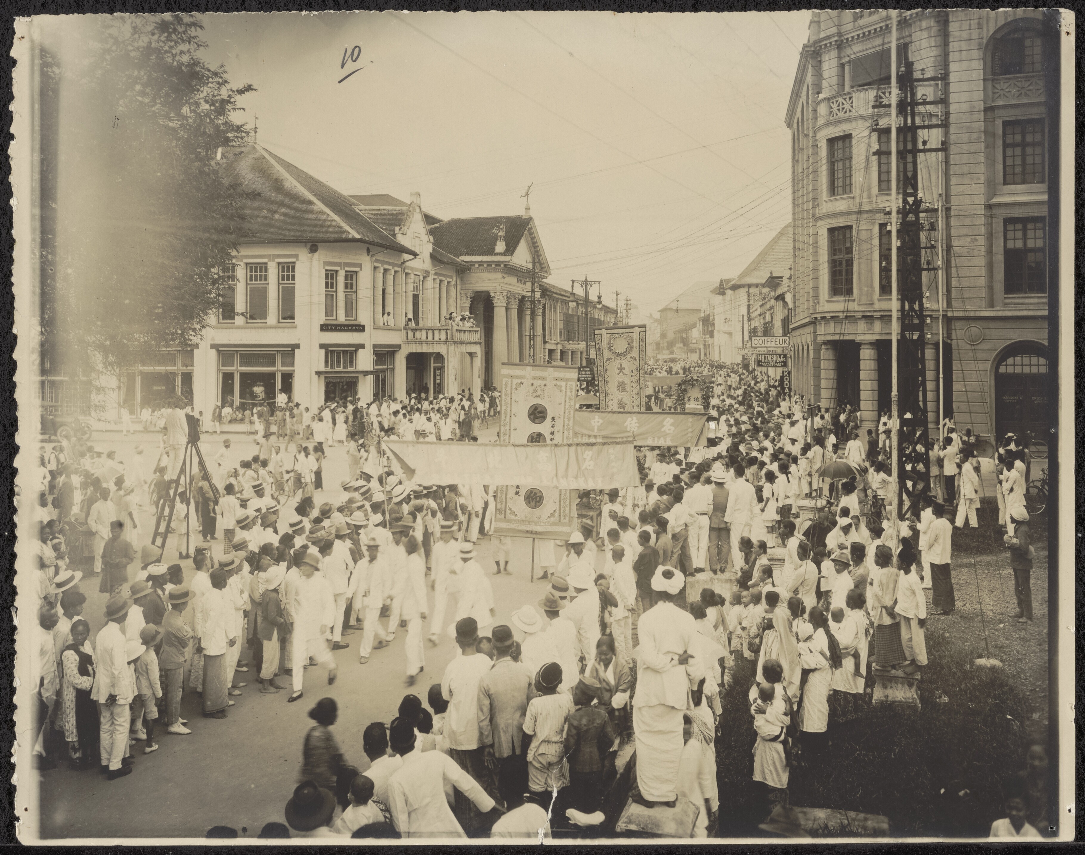 De menigte in een straat te Medan bij de Chinese beg...