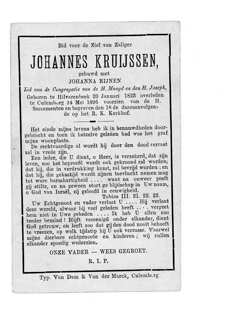 bidprent voor Johannes Kruijssen. Geboren 20-01-1823...