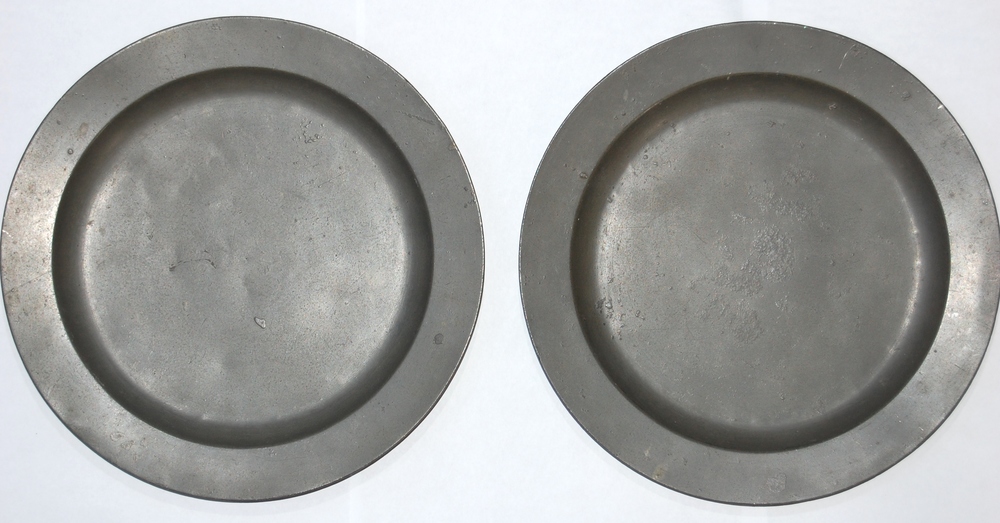 borden, rond plat, gekroonde merken en schildje. Tin...