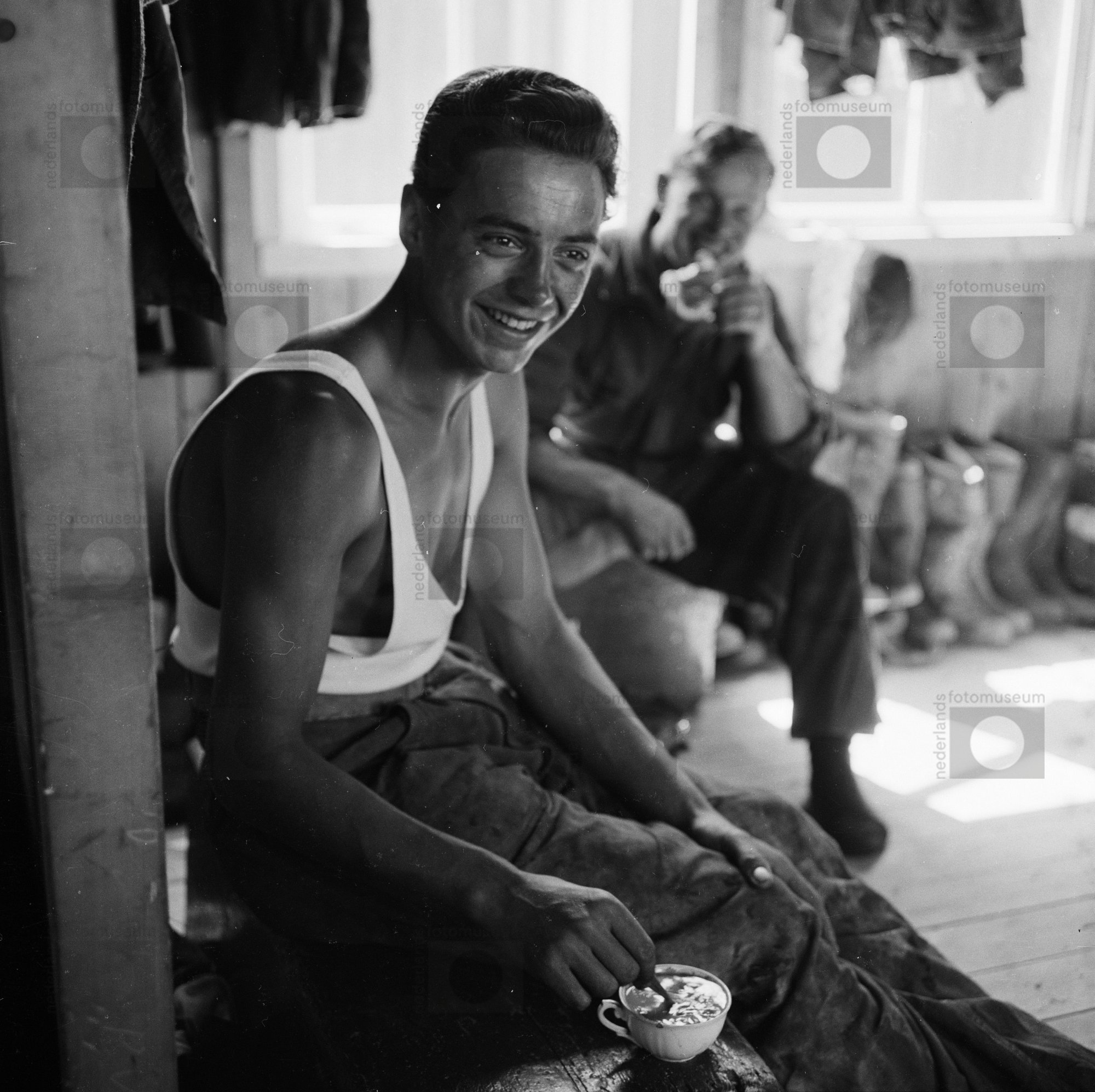 Portret van een arbeider in een barak van het 1e wer...