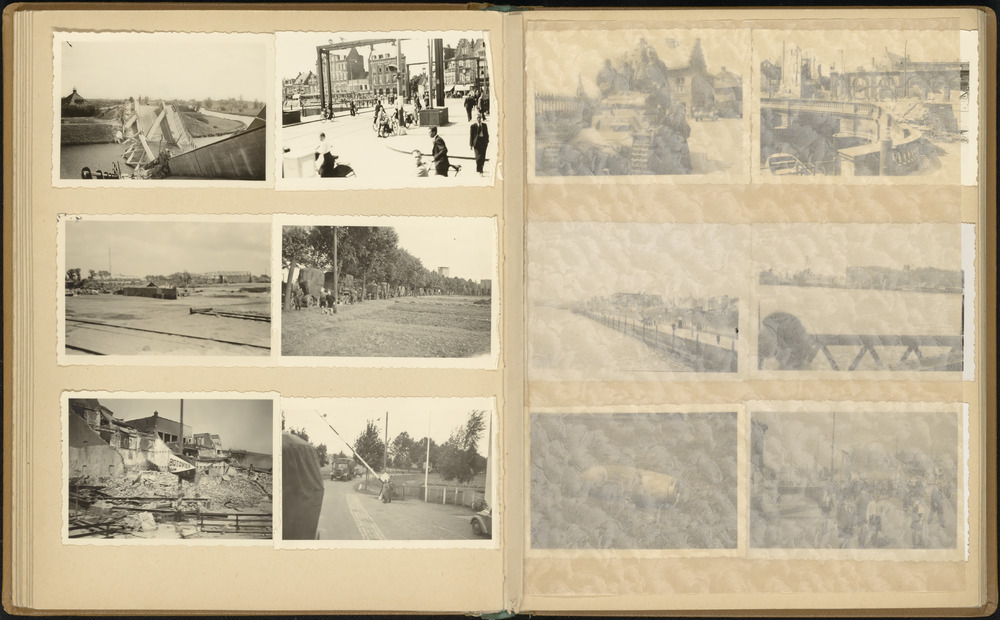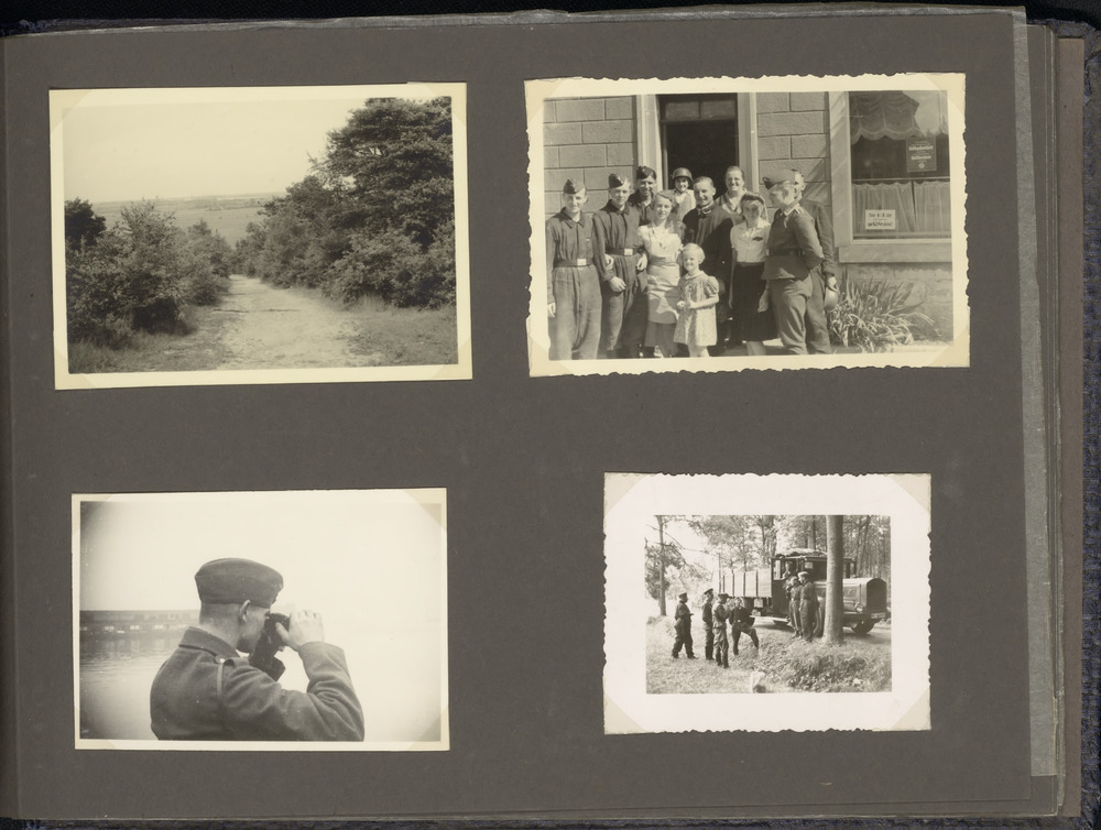 Boven: landschap, groepsfoto met burgers. Onder: mil...
