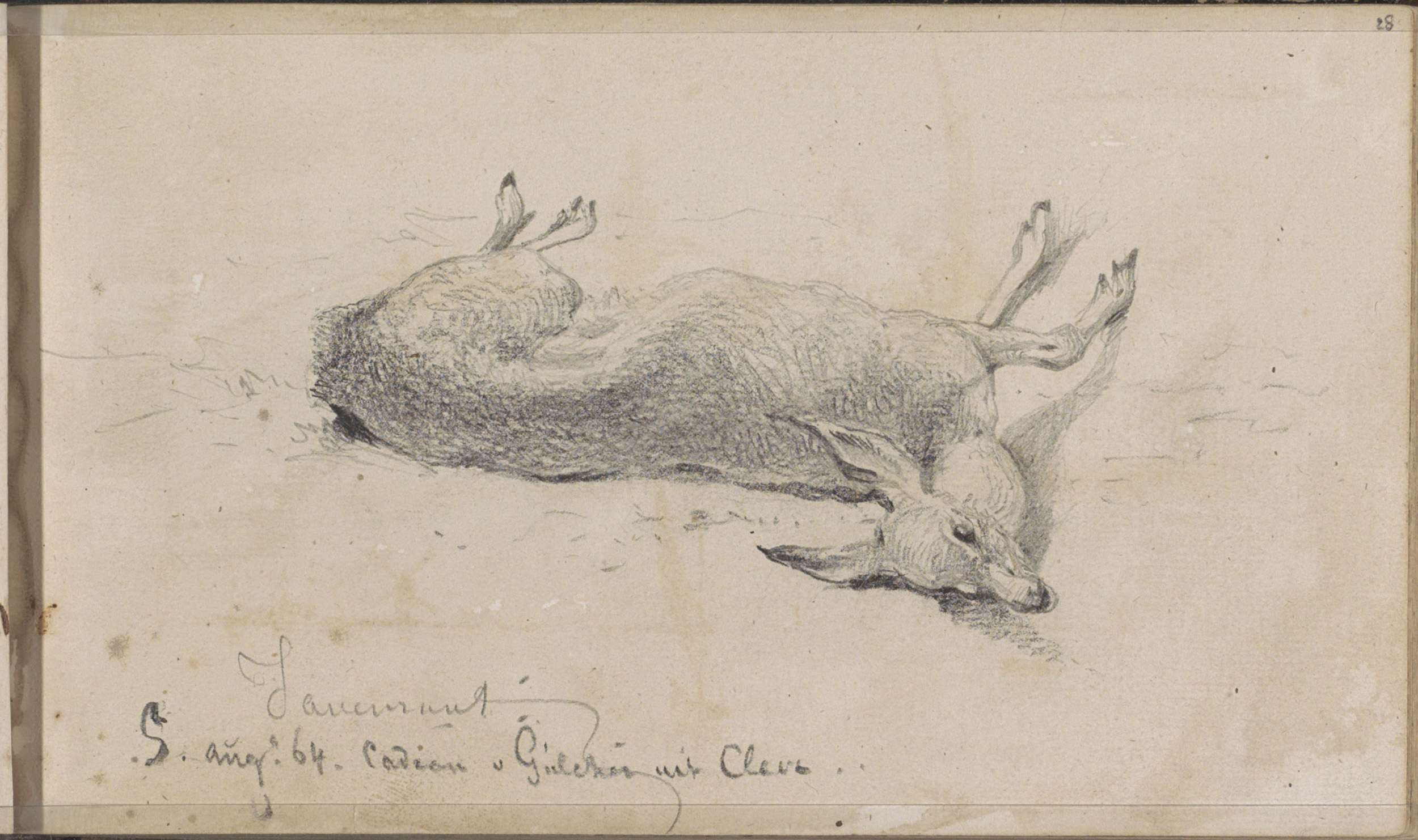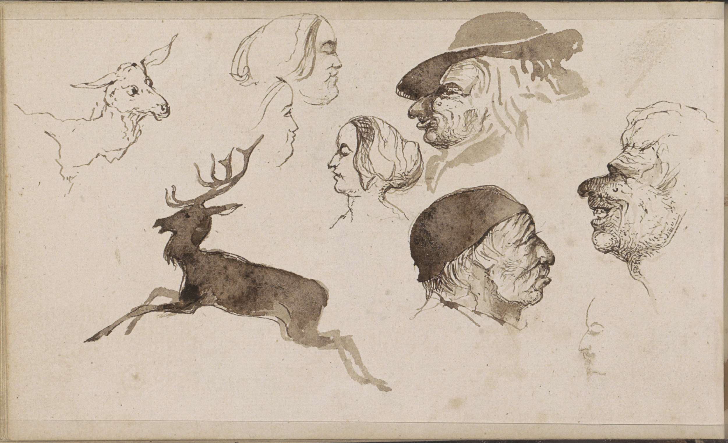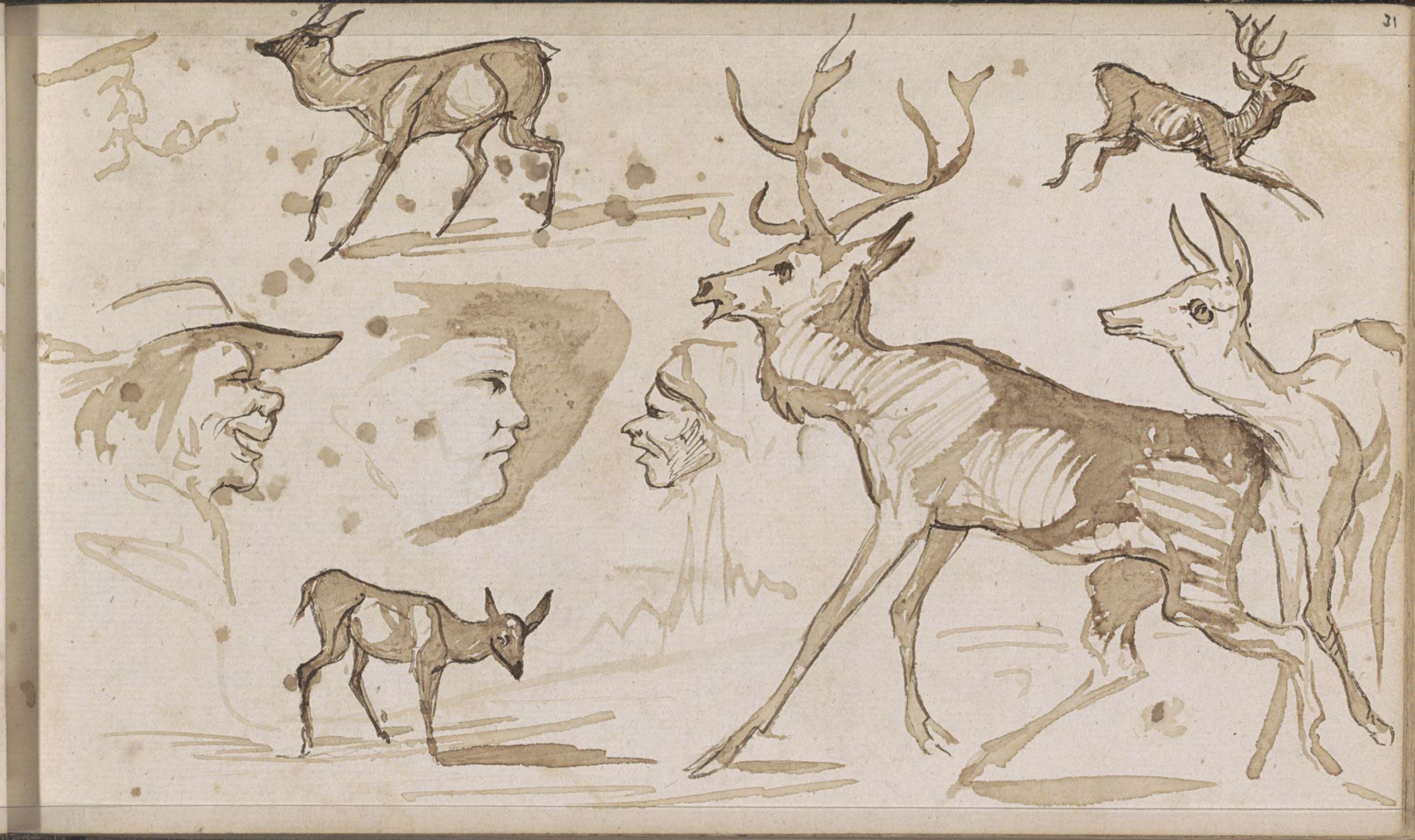 Hert, een ree en mannen- en vrouwenkoppen