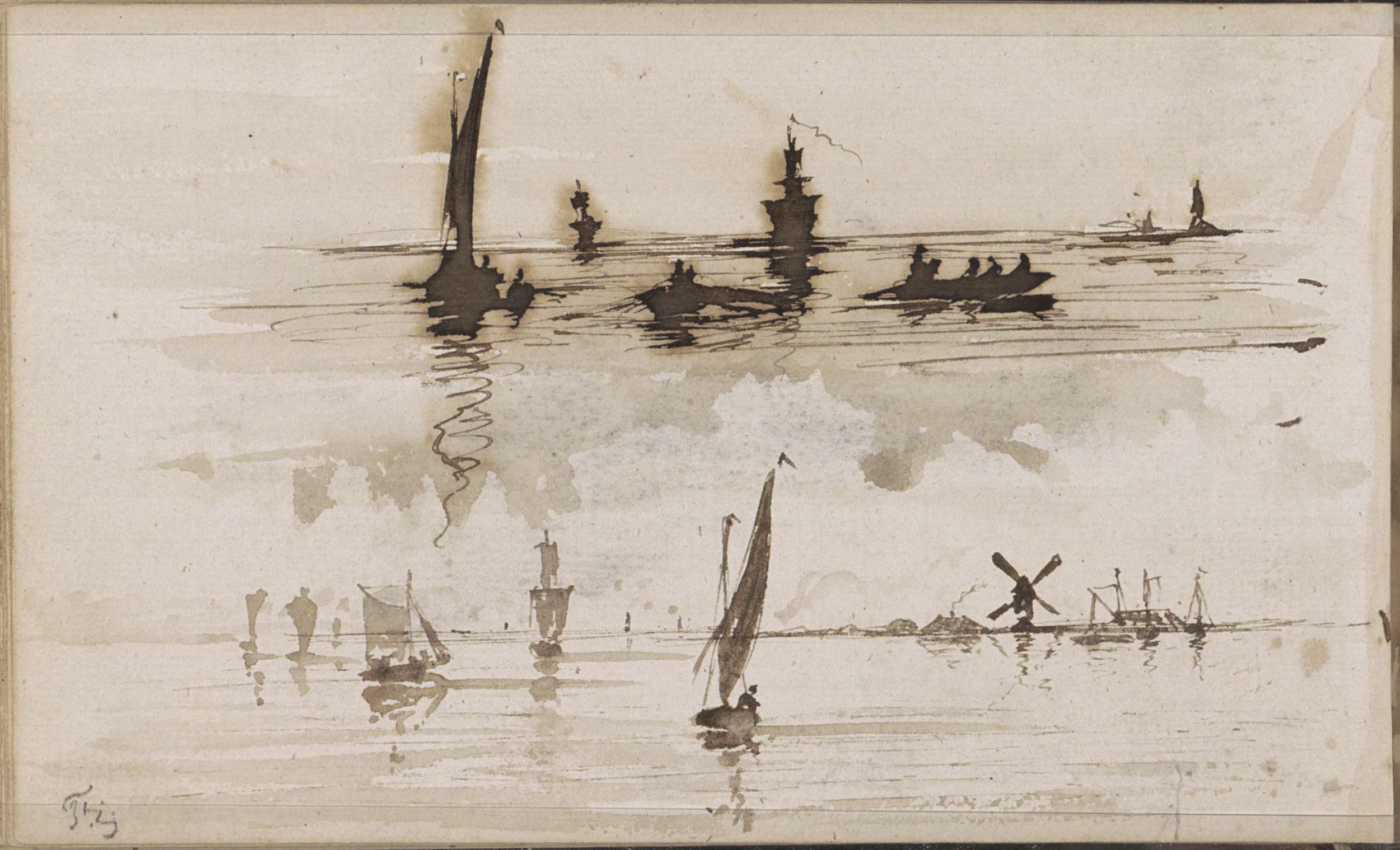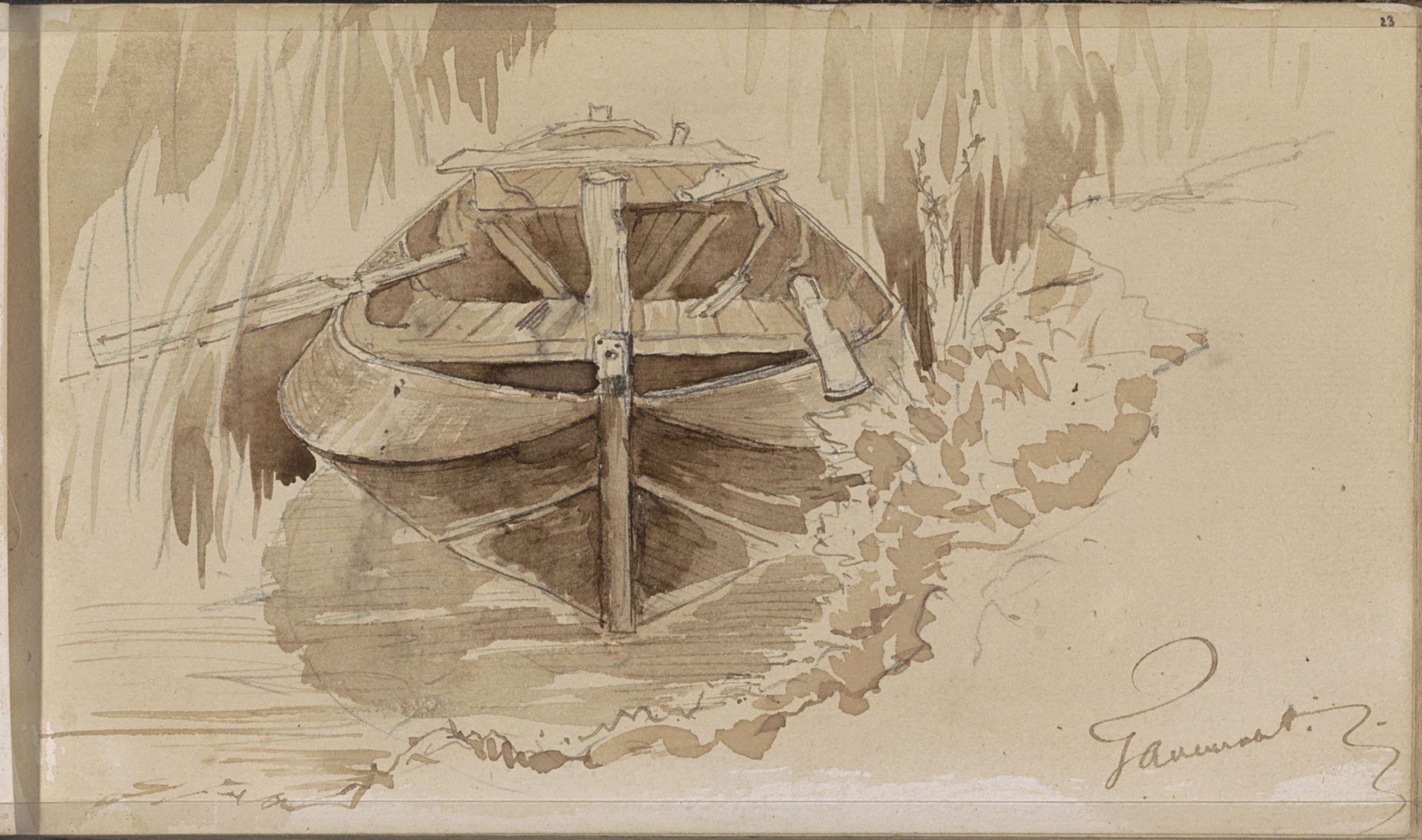Rivier met figuren in roeiboten