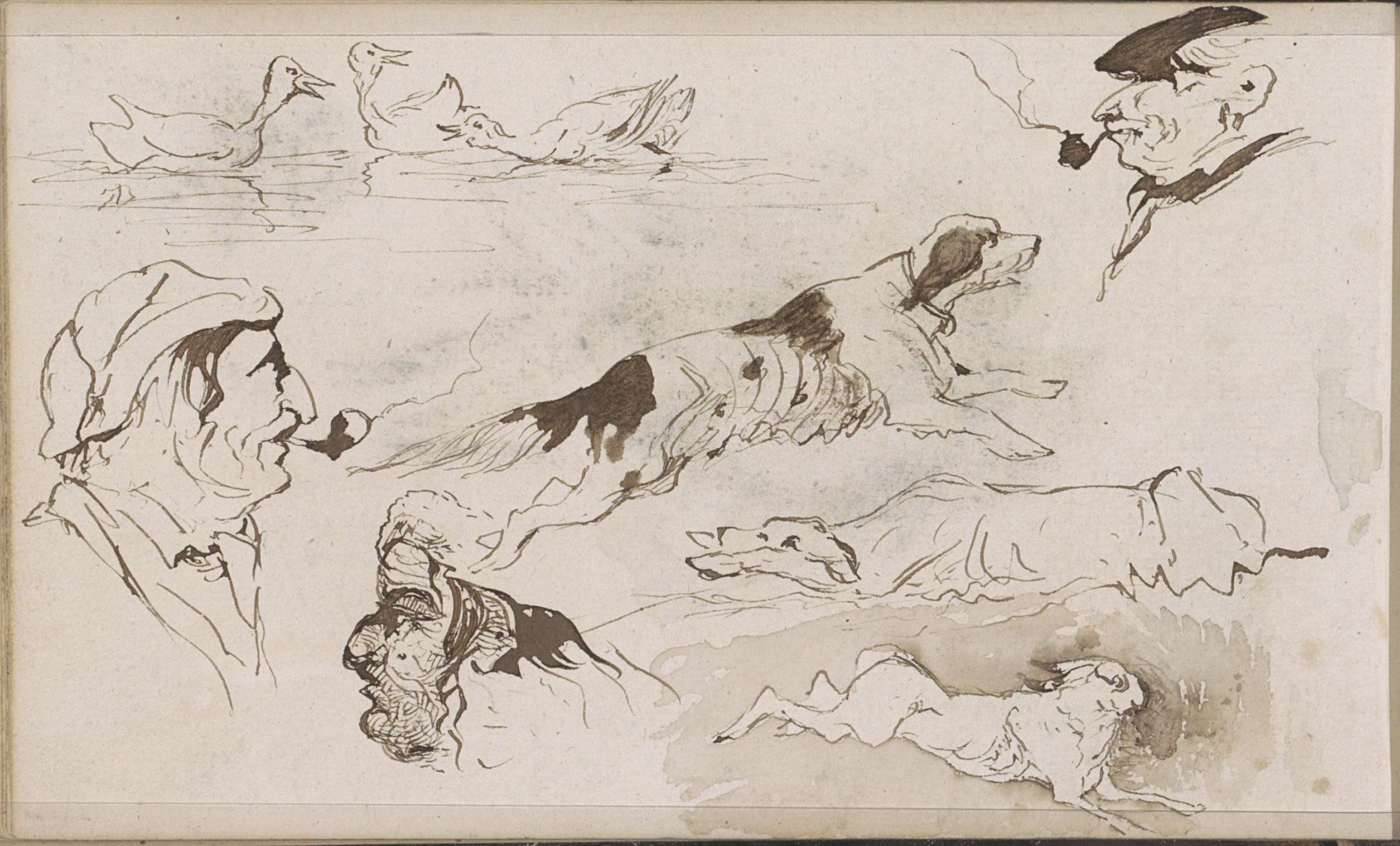Eenden, honden, een haas en mannenkoppen