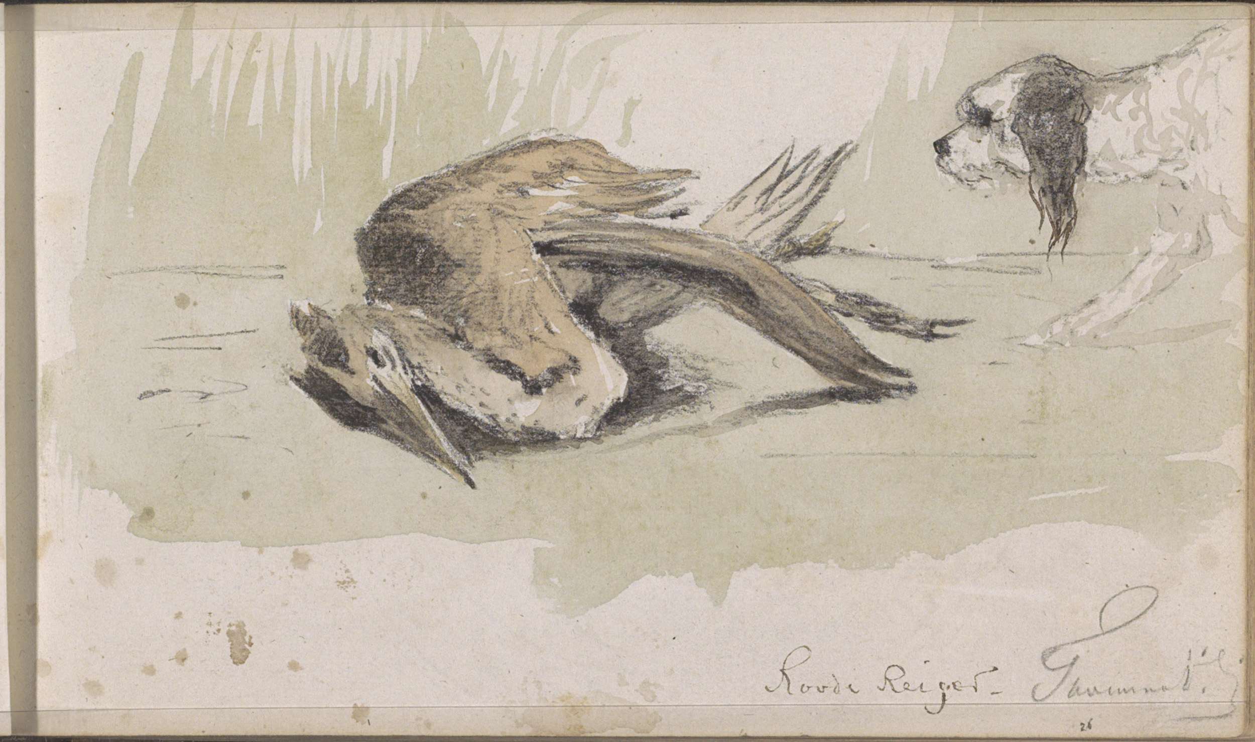 Hond bij een dode rode reiger