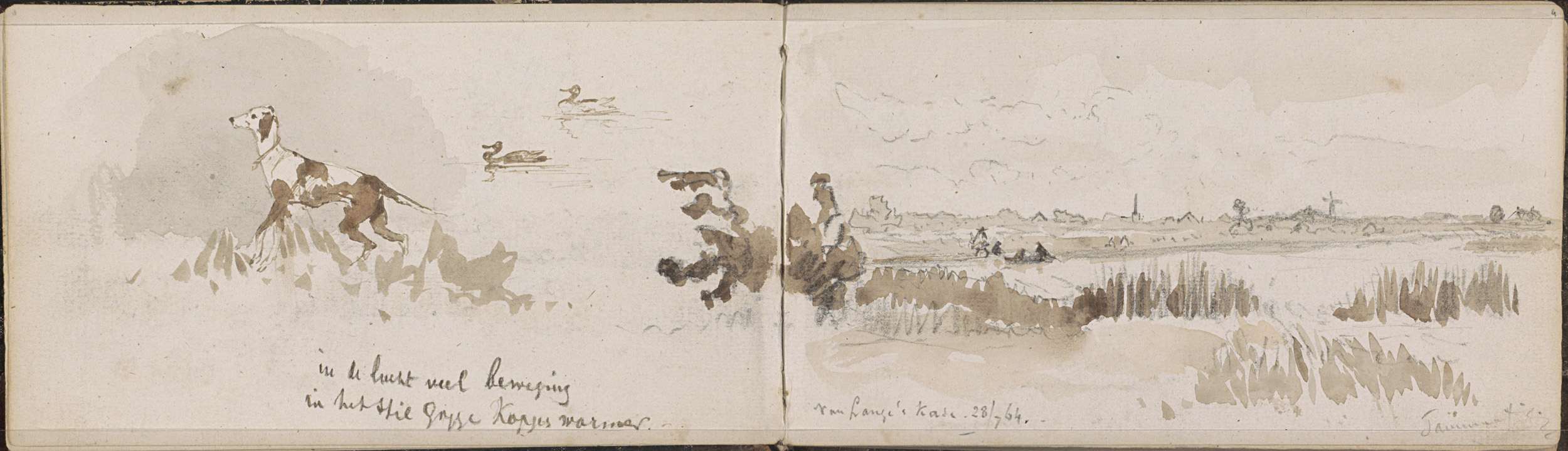 Eenden, een hond in het gras en de Lange Kade aan de...