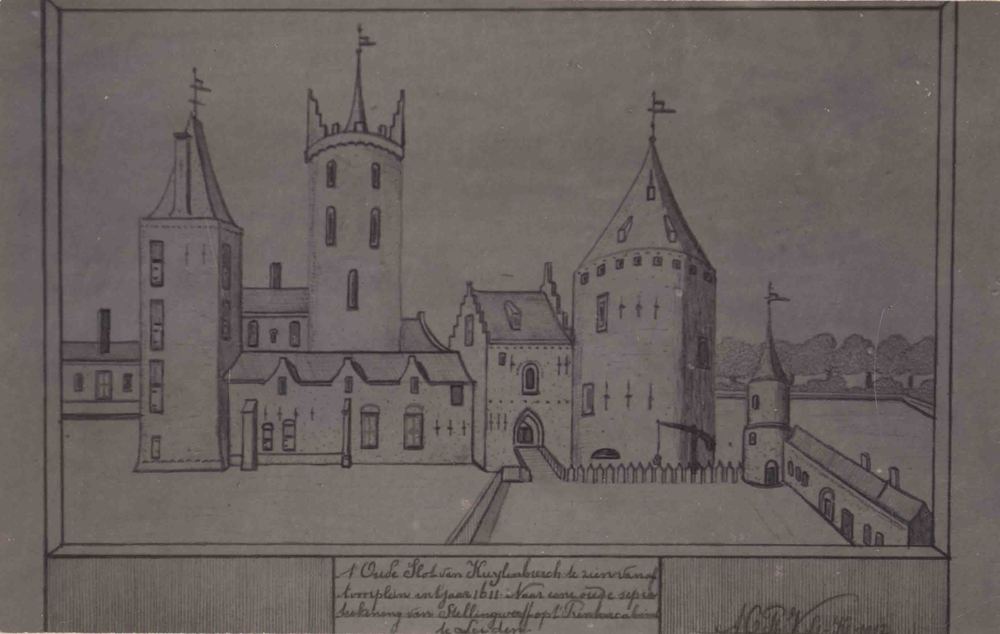 Foto, voorstellende tekening van het kasteel te Cule...