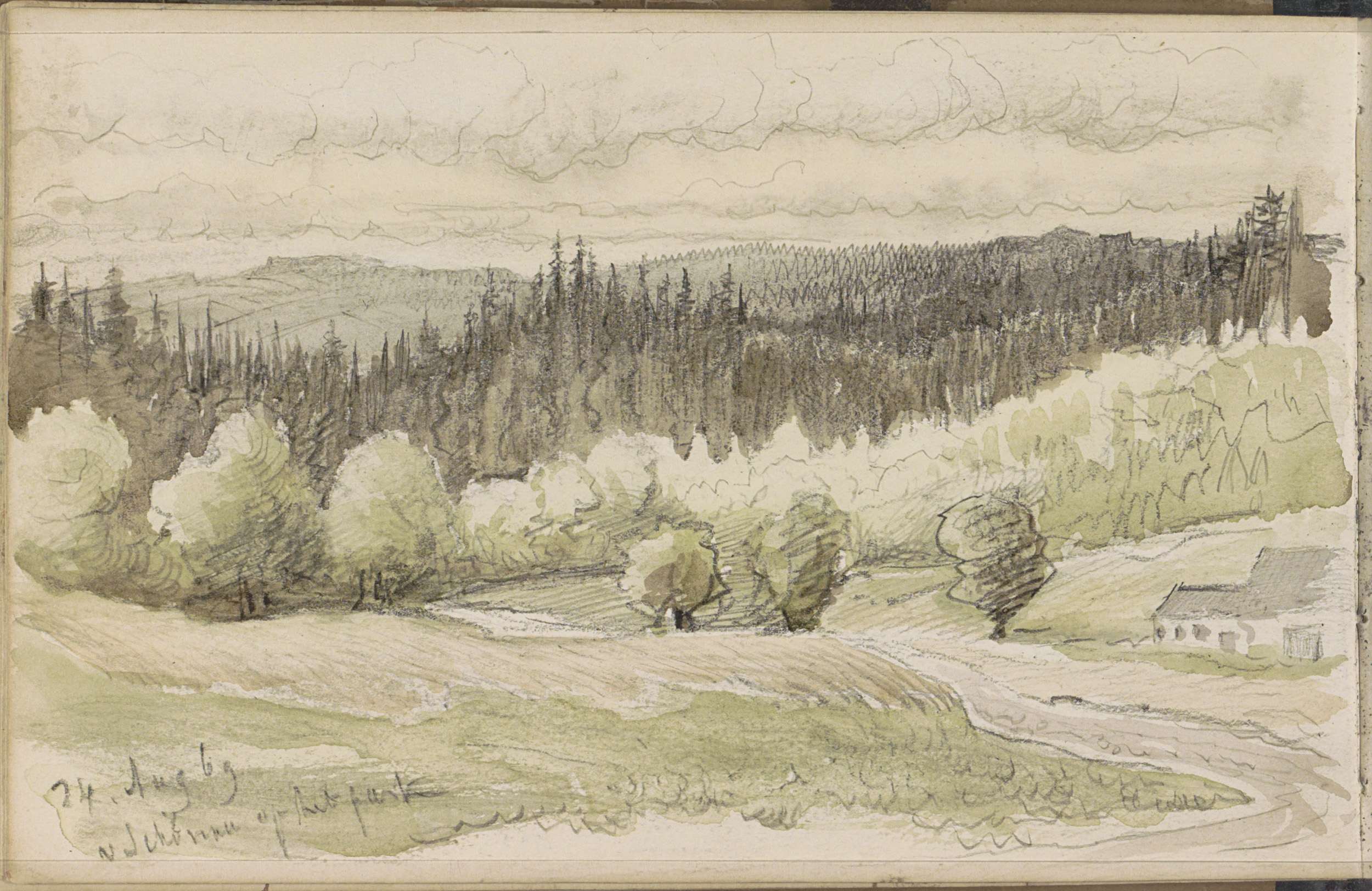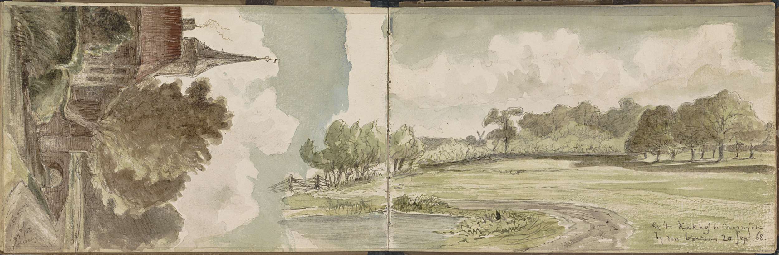 Kerk aan een weg en een landschap bij het kerkhof te...