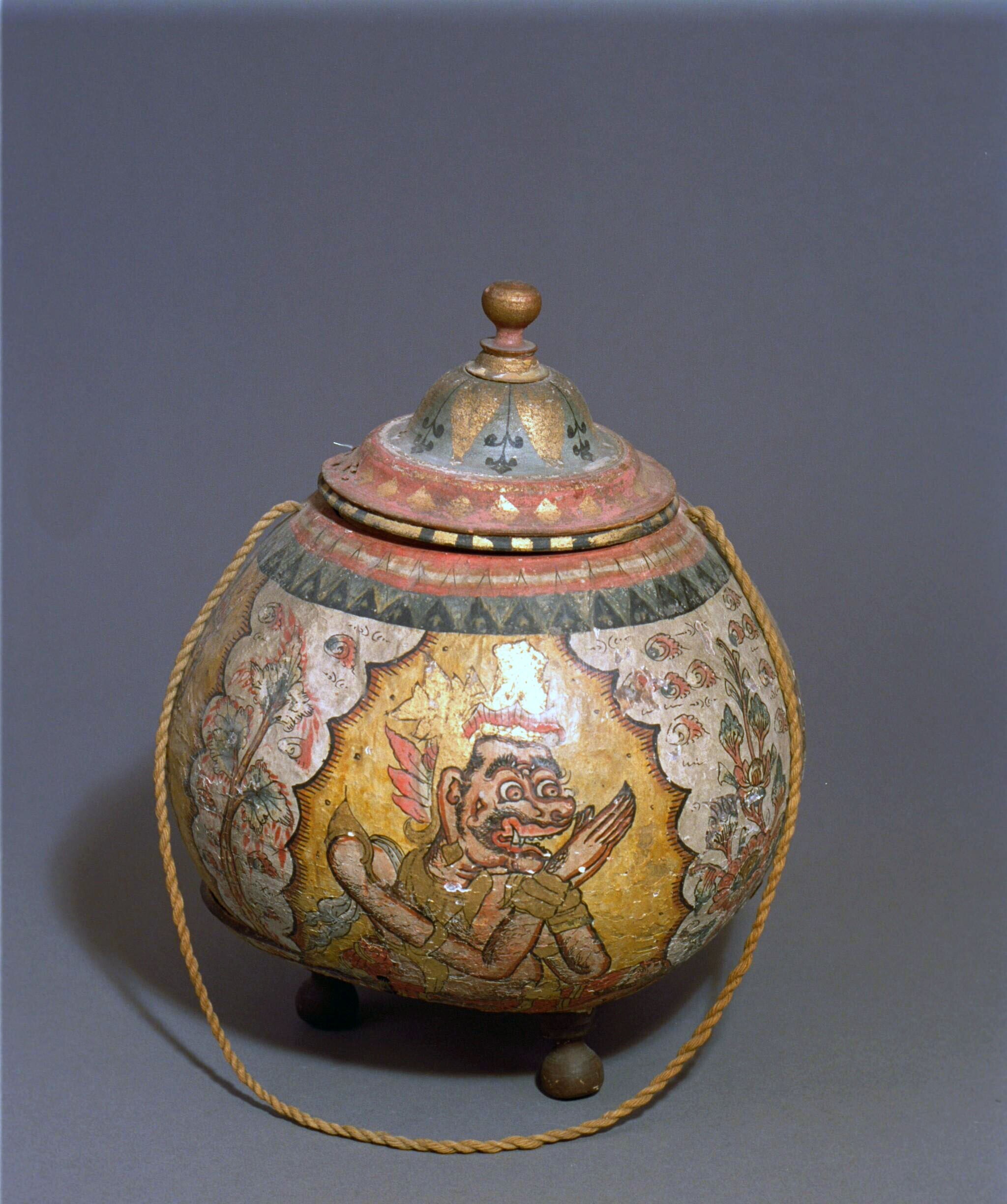 Wijwatervat van een beschilderde kokosdop op drie ho...