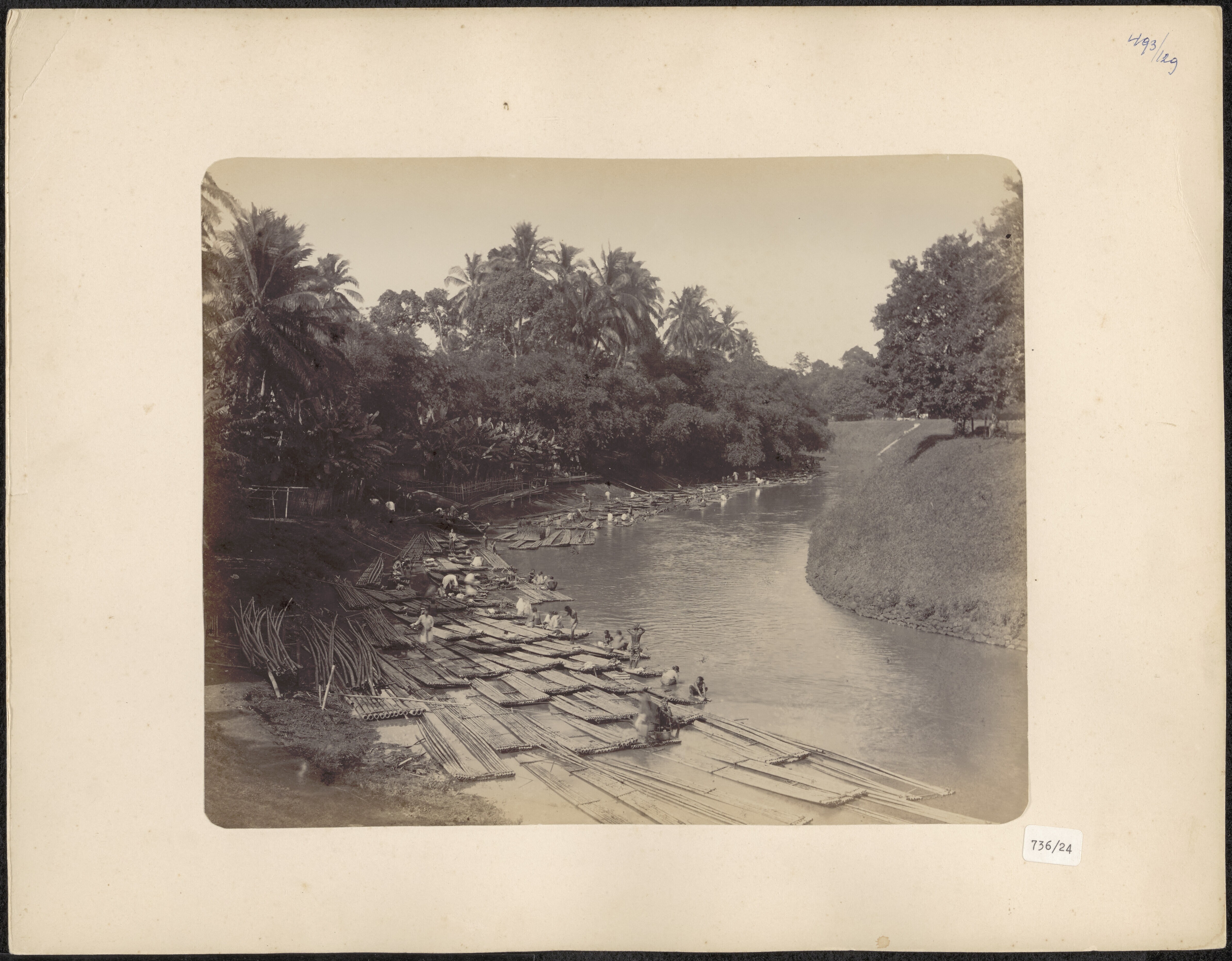 Het wassen van kleding op vlotten van bamboe in de r...