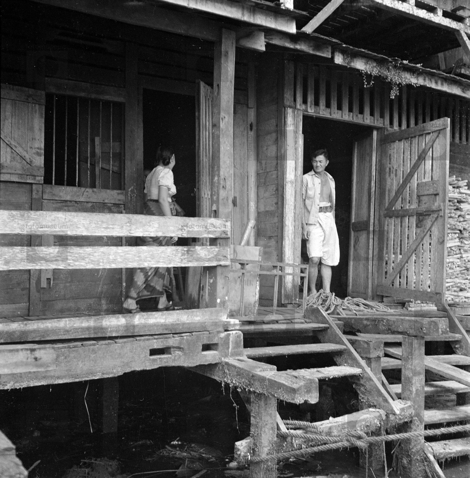 Een man staat in de deuropening van zijn paalwoning,...