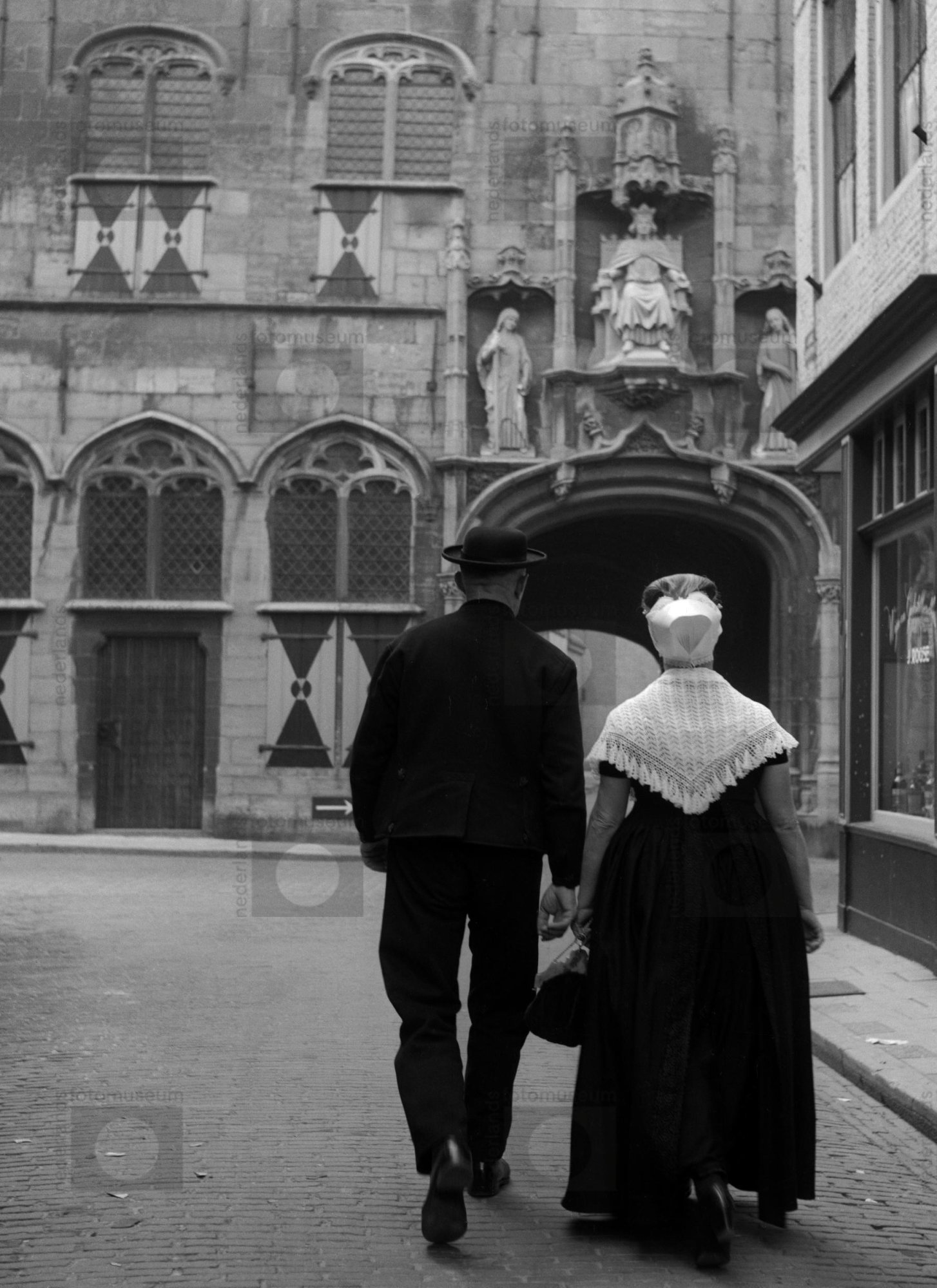 Man en vrouw in klederdracht van Walcheren bij de ab...